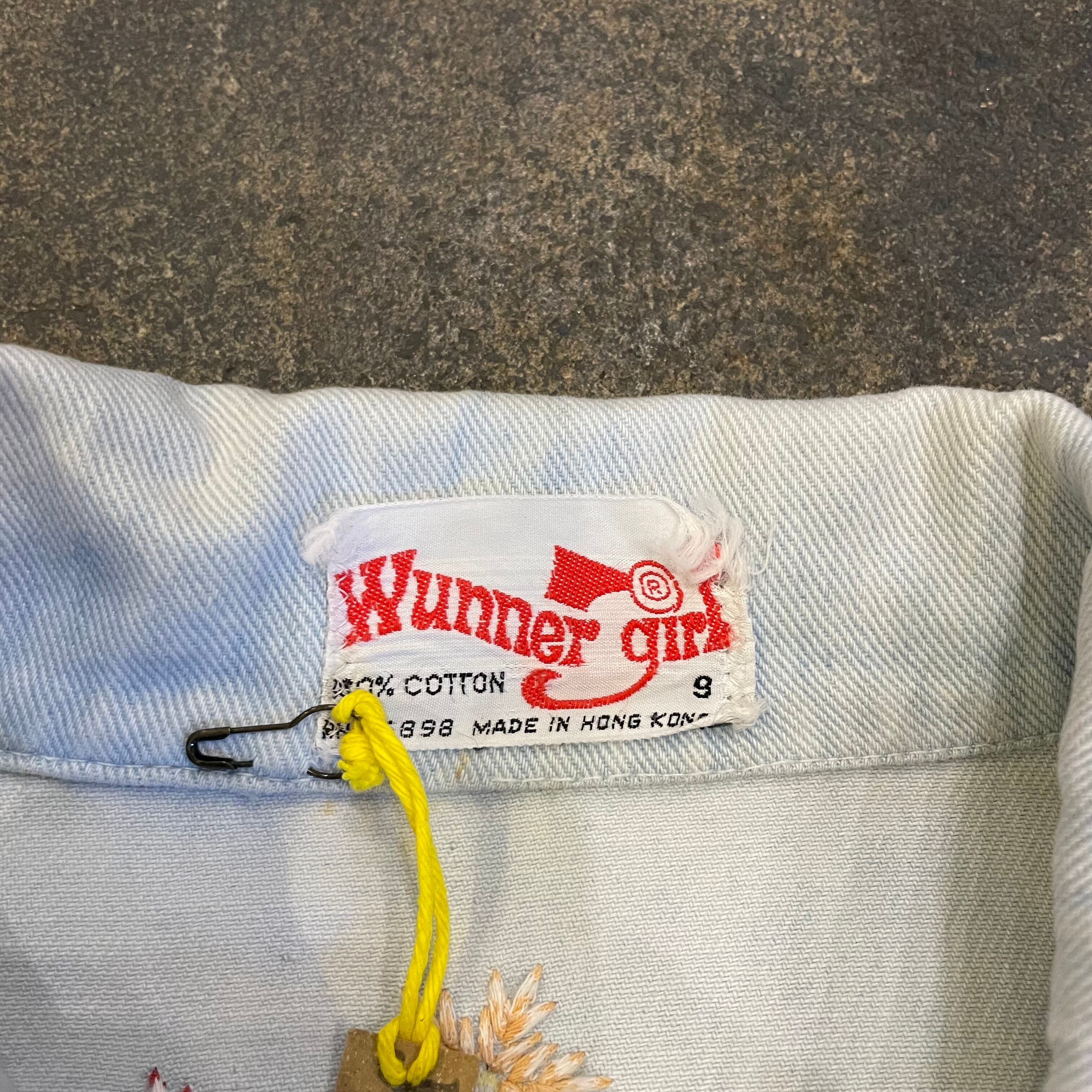 大胆に裾がカットされた70年代頃のデニムシャツです。お花やキノコ、てんとう虫、月などのヒッピーなモチーフの刺繍がかわいいですね。