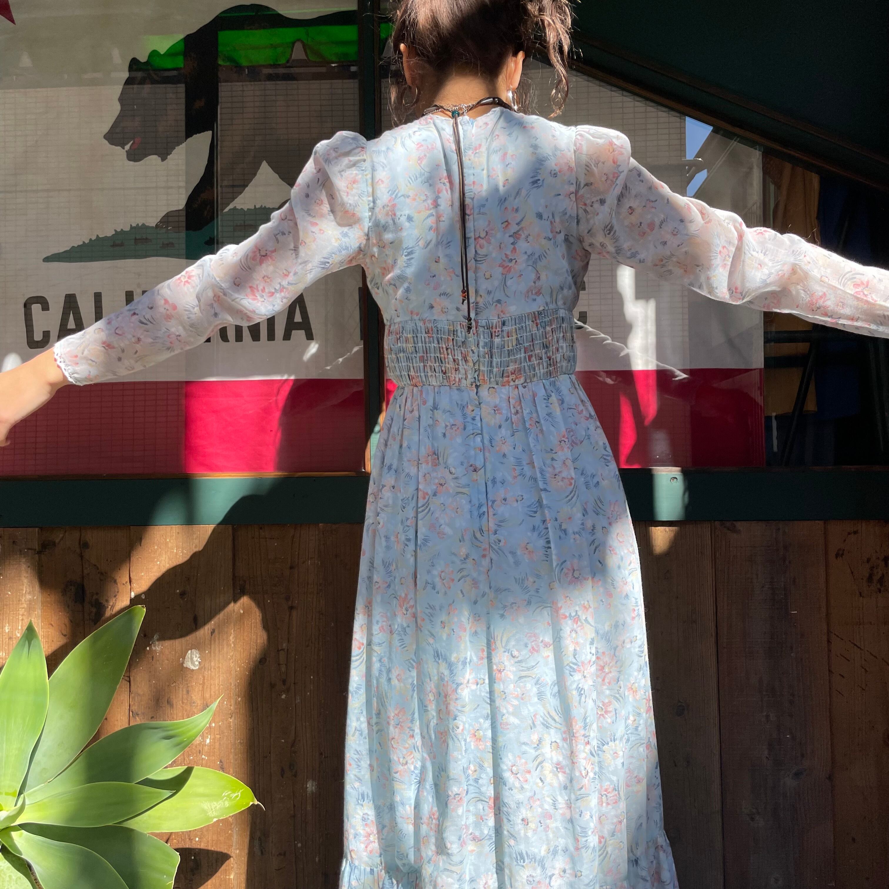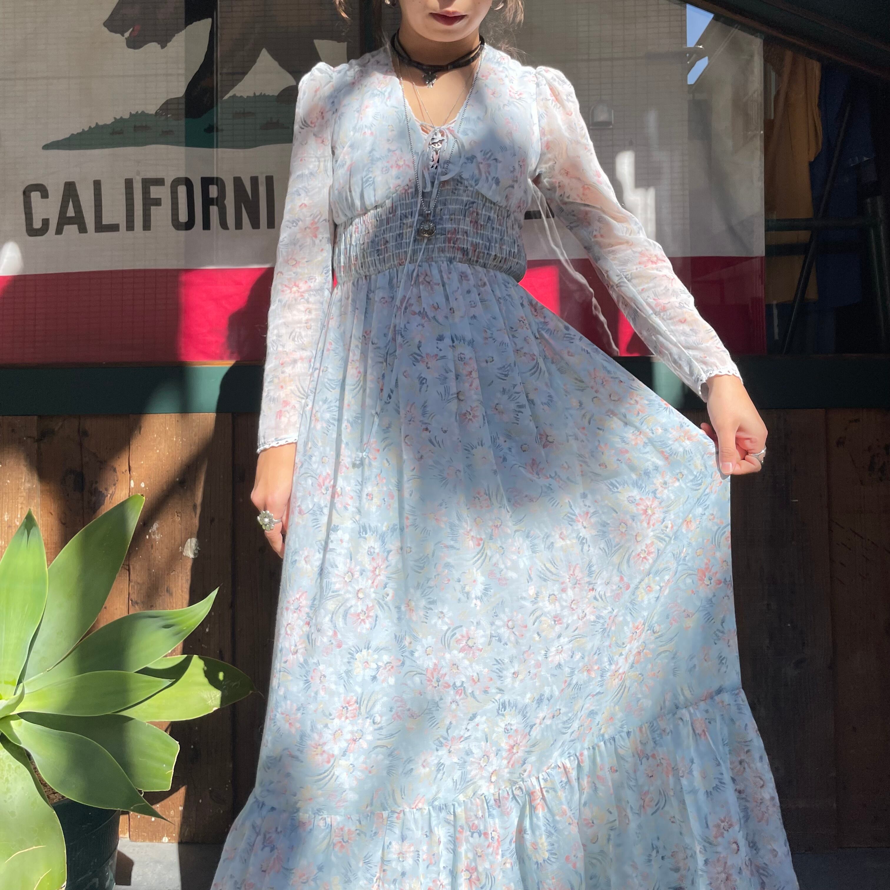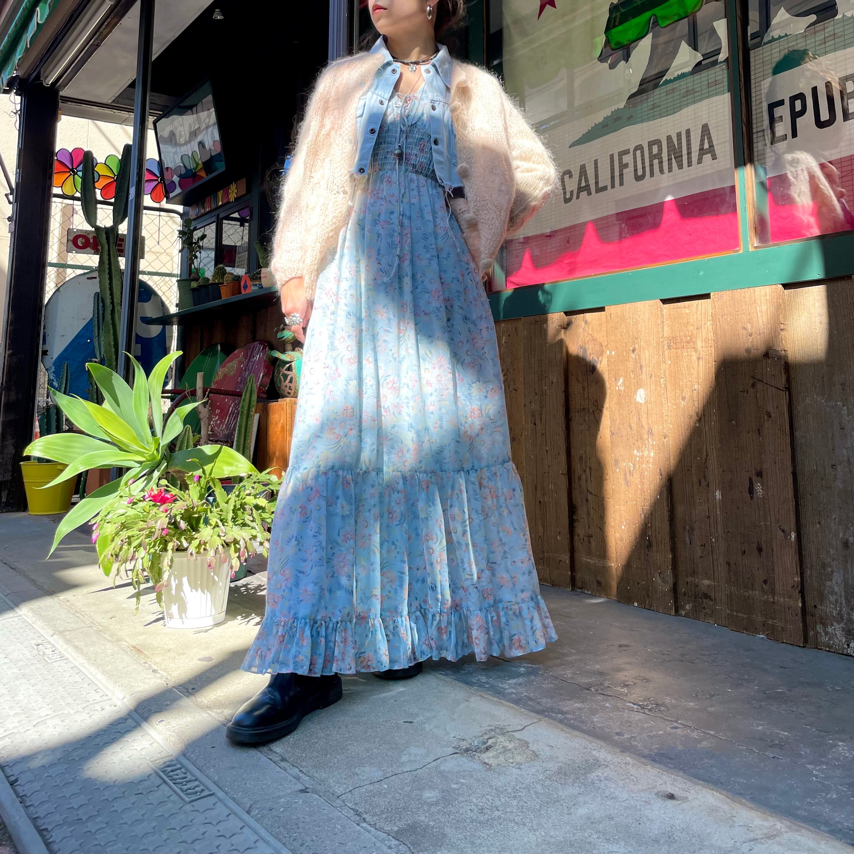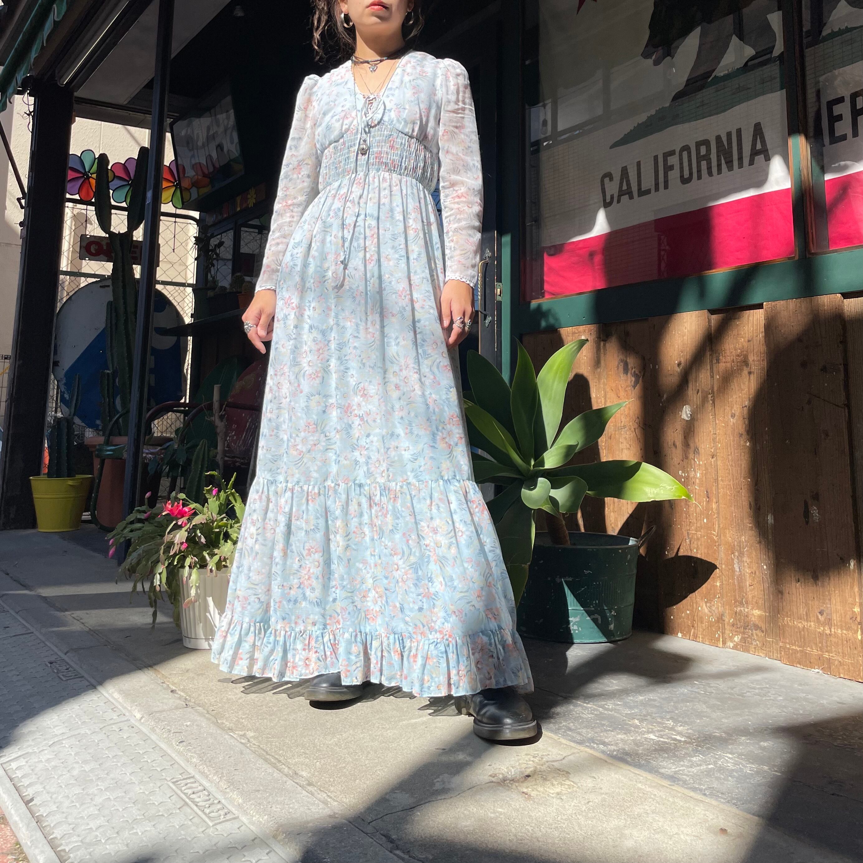 シースルーな生地感が春らしい爽やかな70年代頃のワンピースです。淡い水色が可憐な雰囲気で美しいですね。