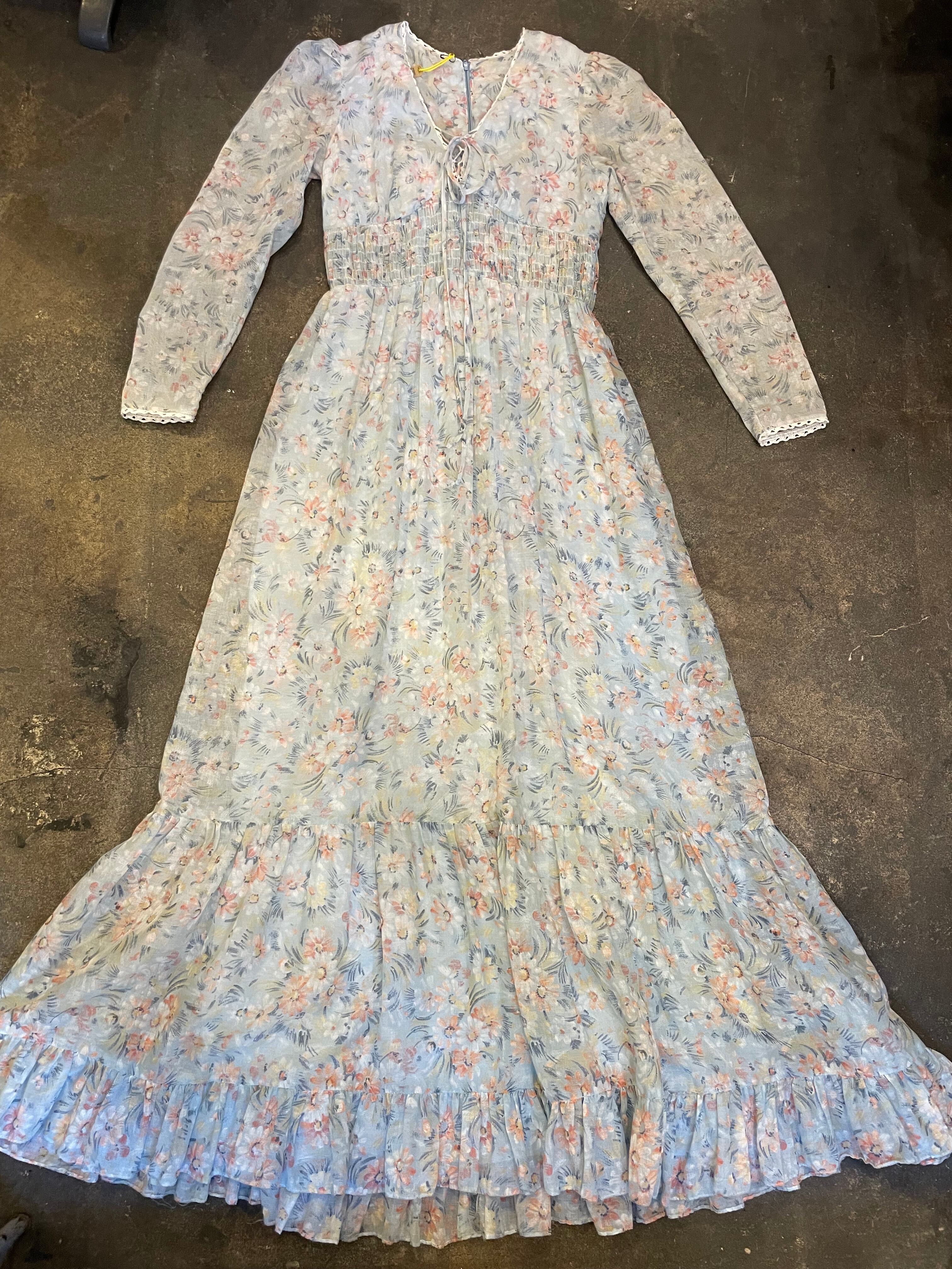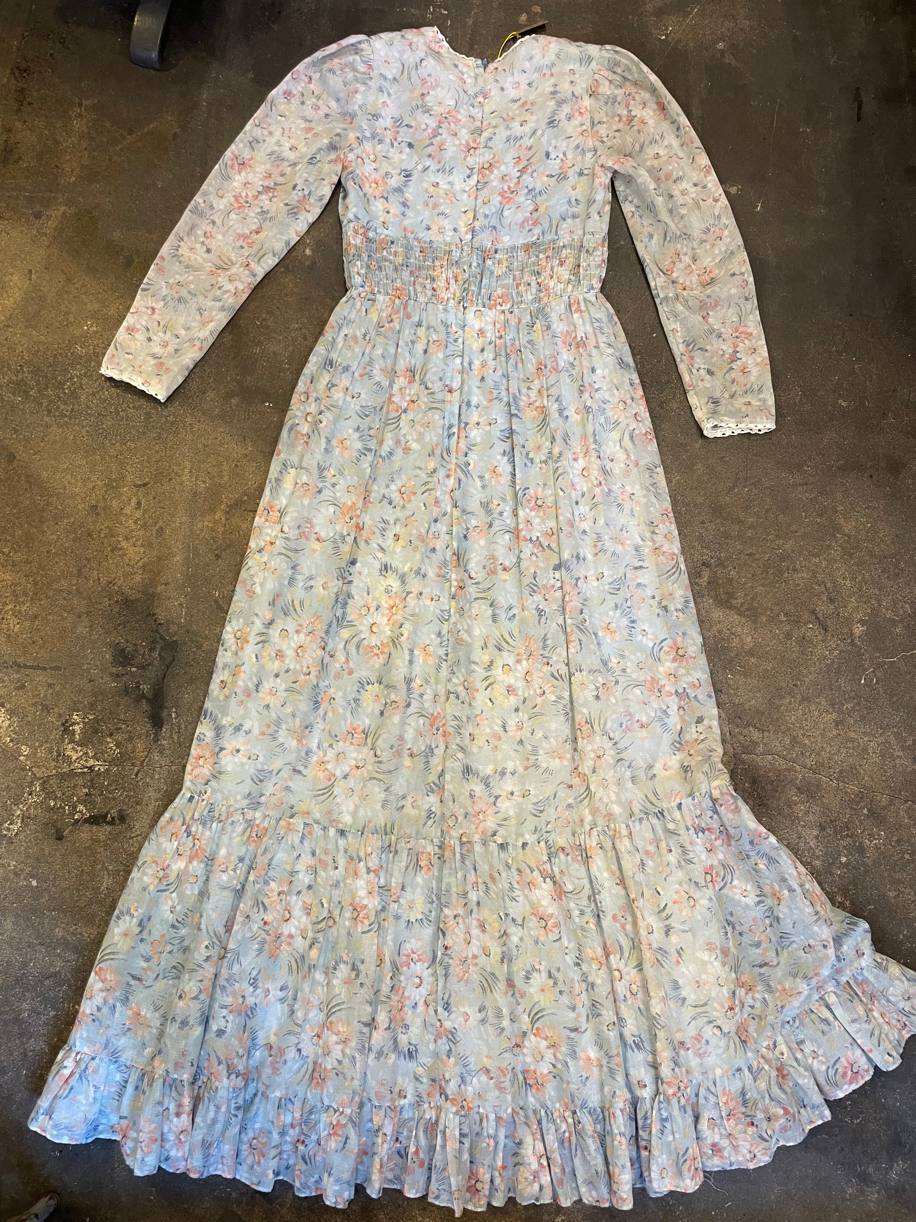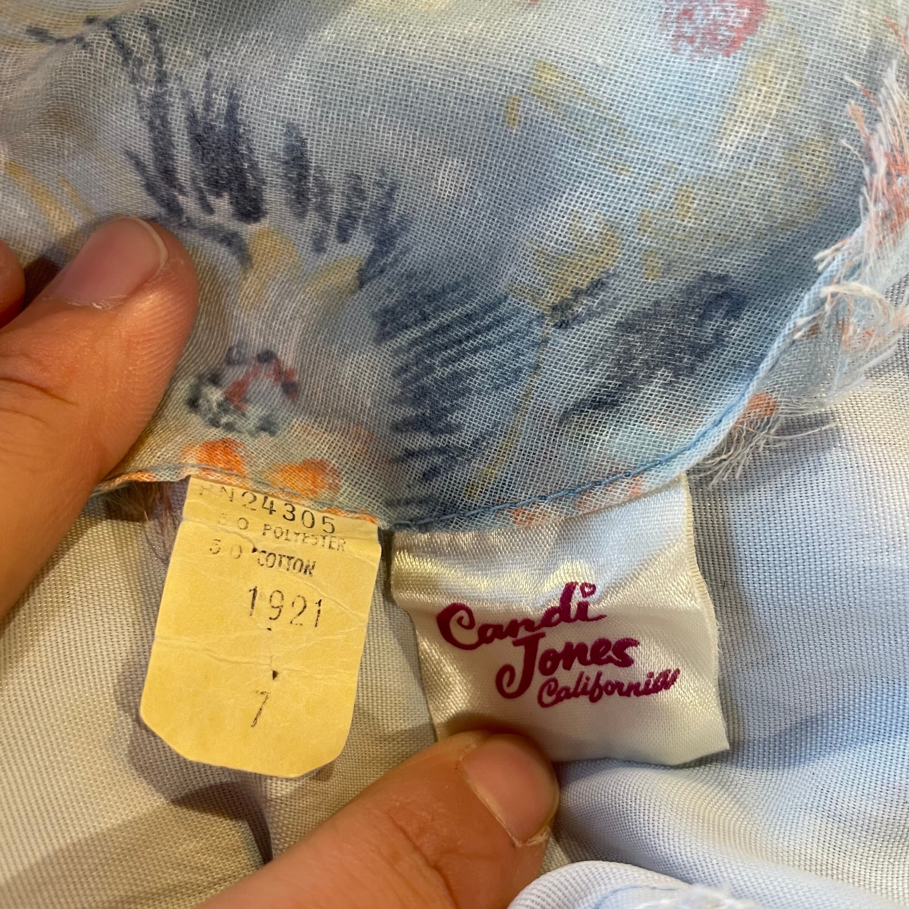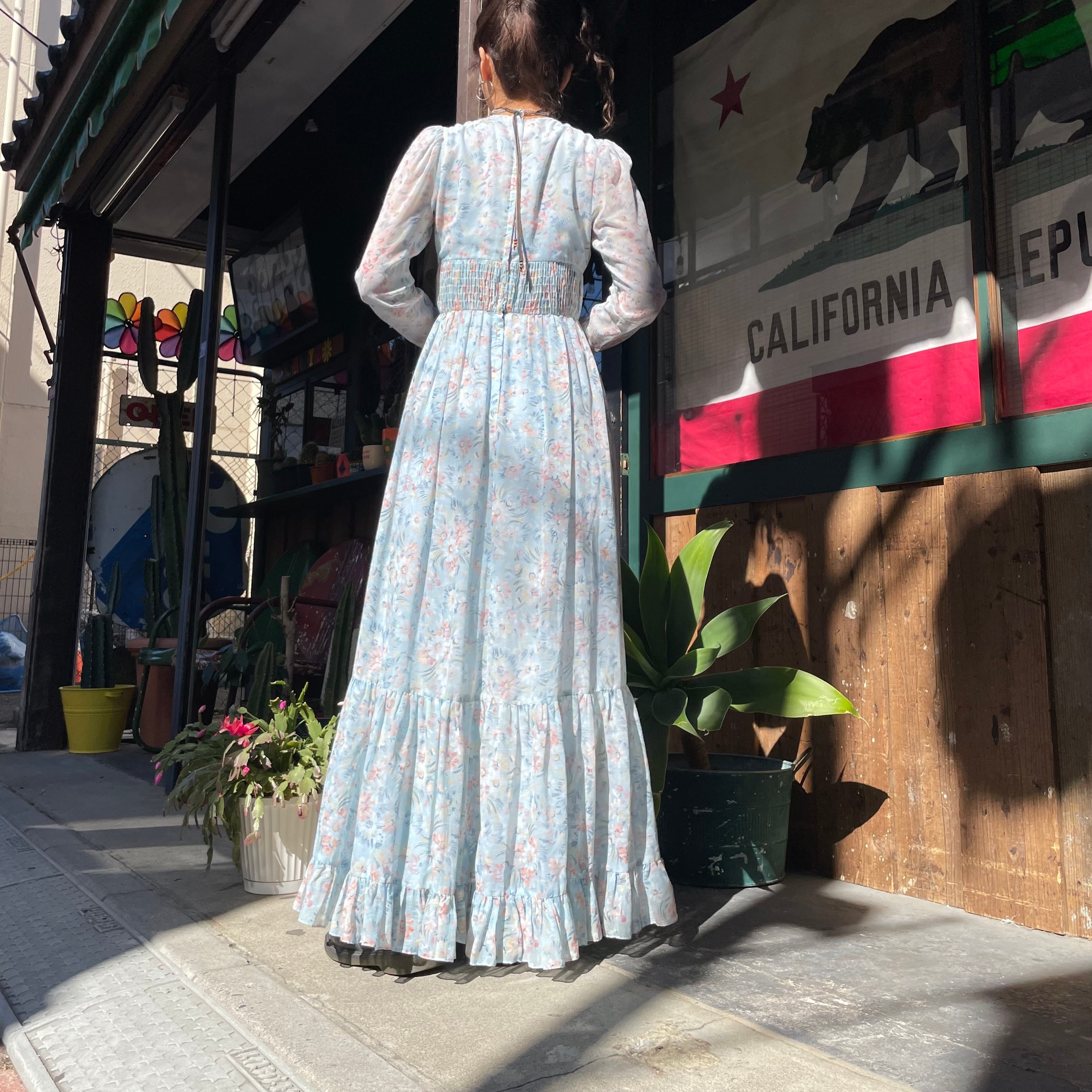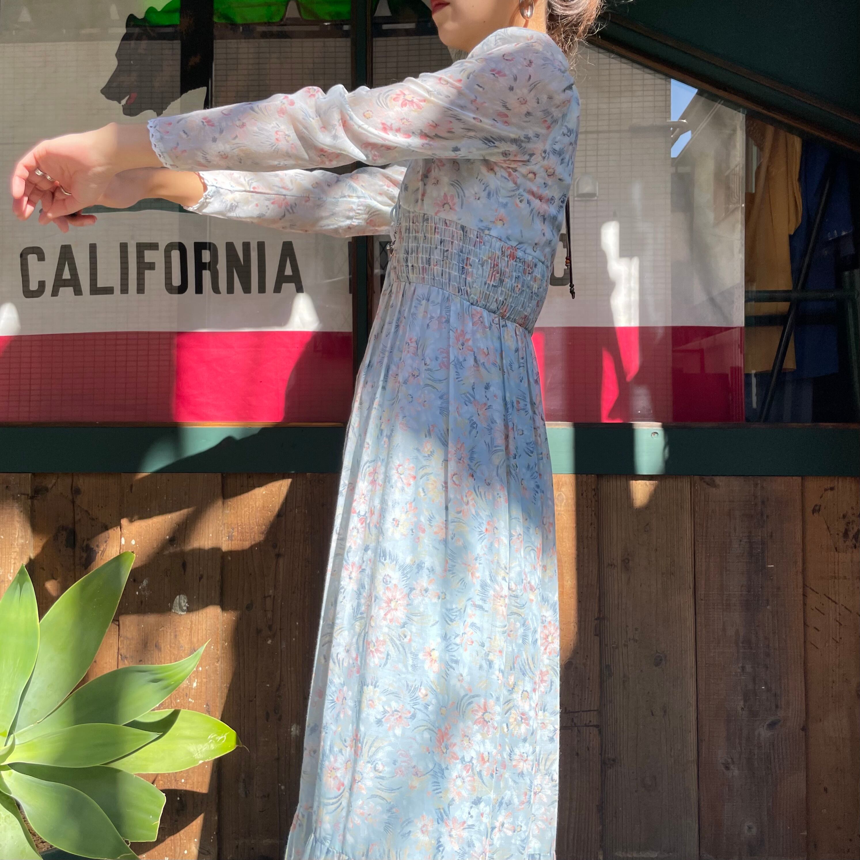 シースルーな生地感が春らしい爽やかな70年代頃のワンピースです。淡い水色が可憐な雰囲気で美しいですね。