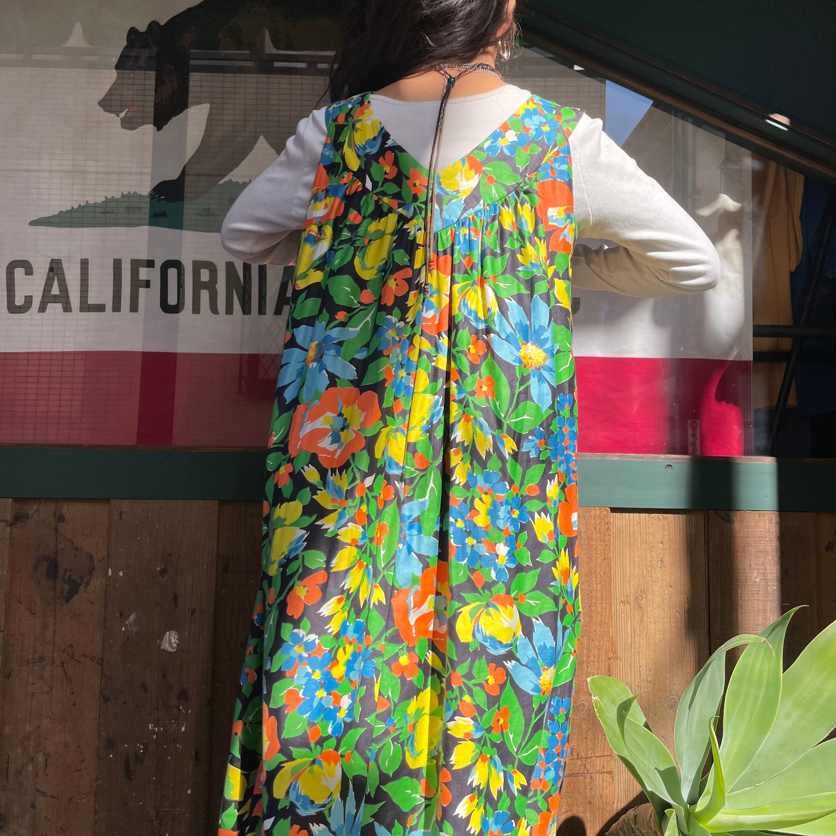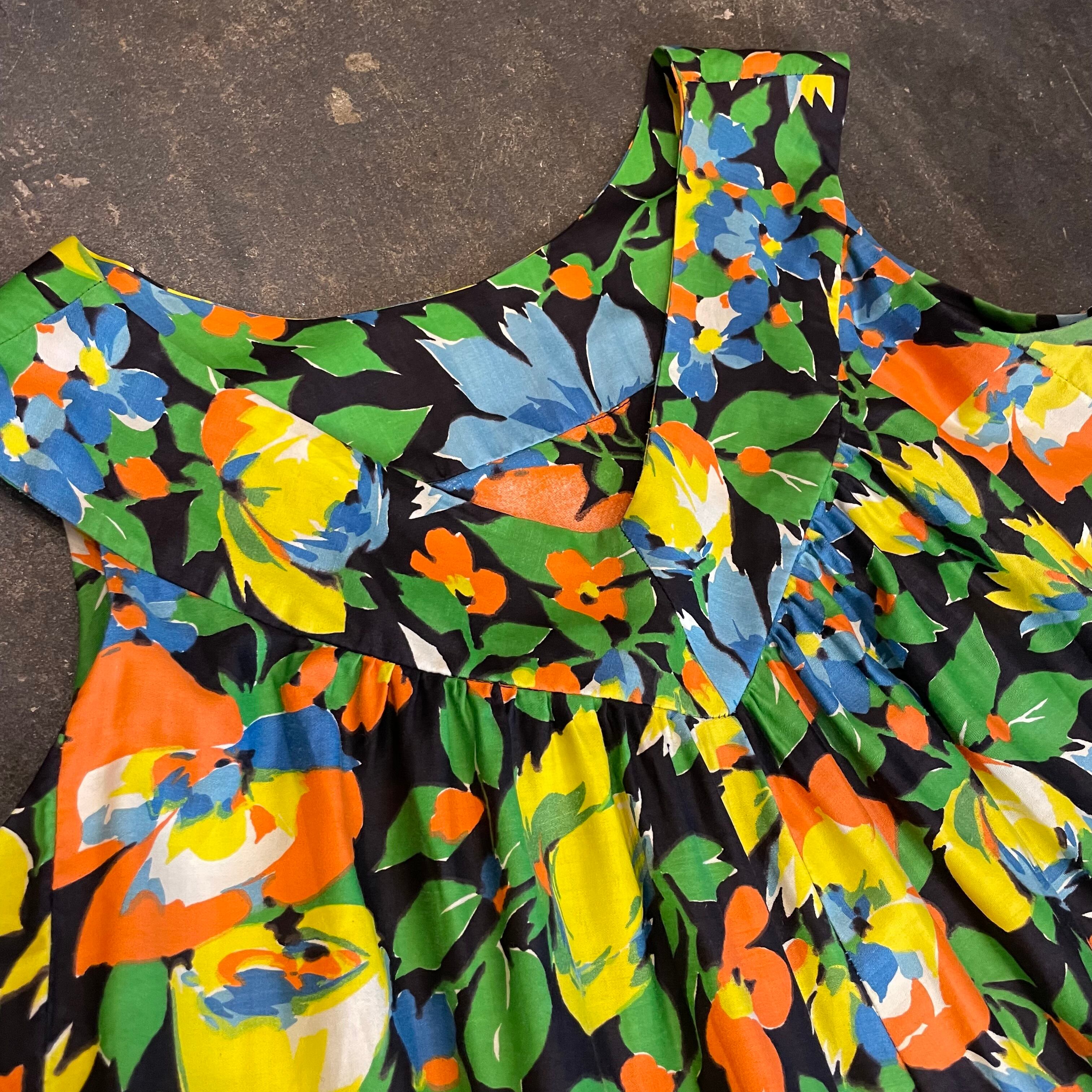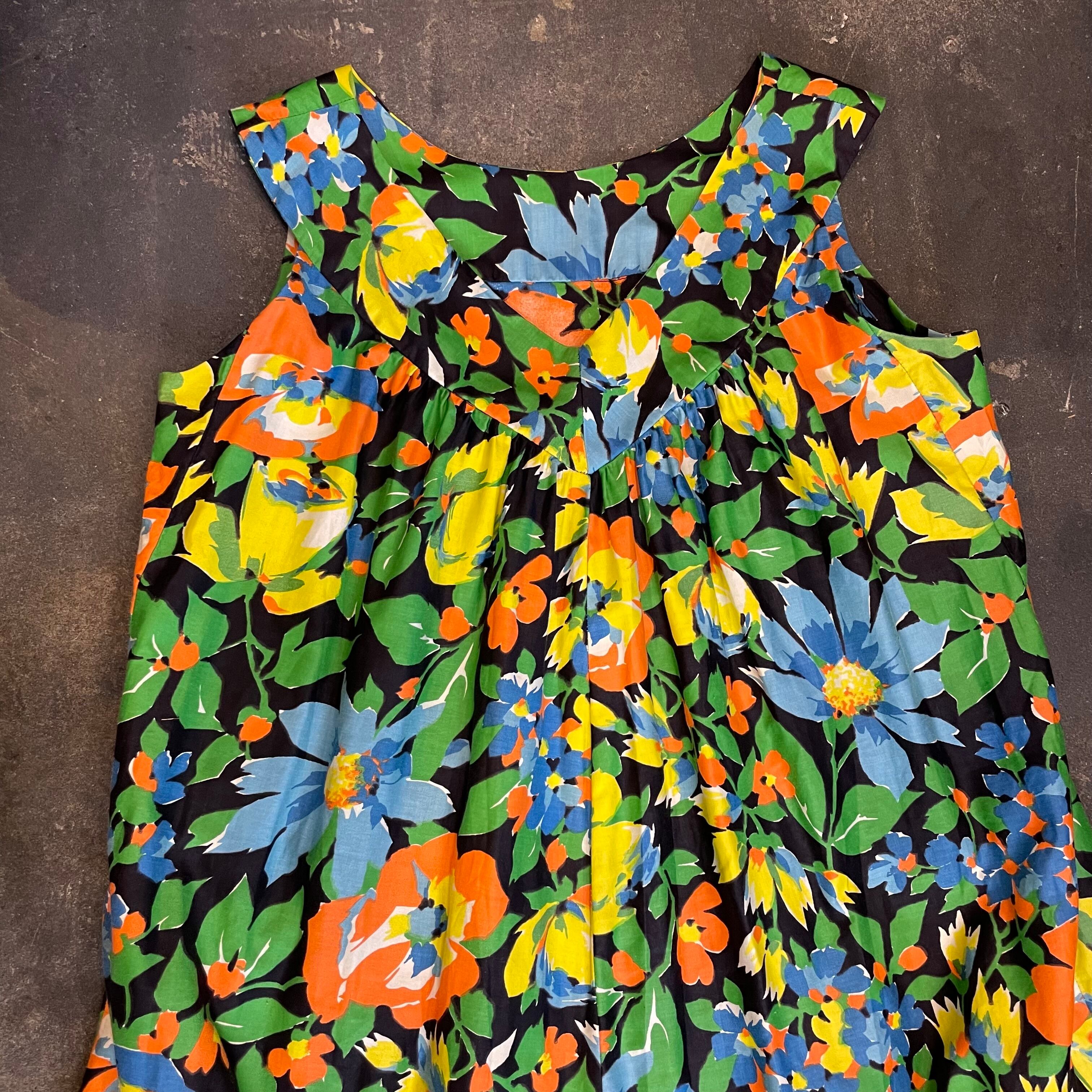黒ベースにハッピーカラーのお花達がかわいいノースリーブのワンピースです。