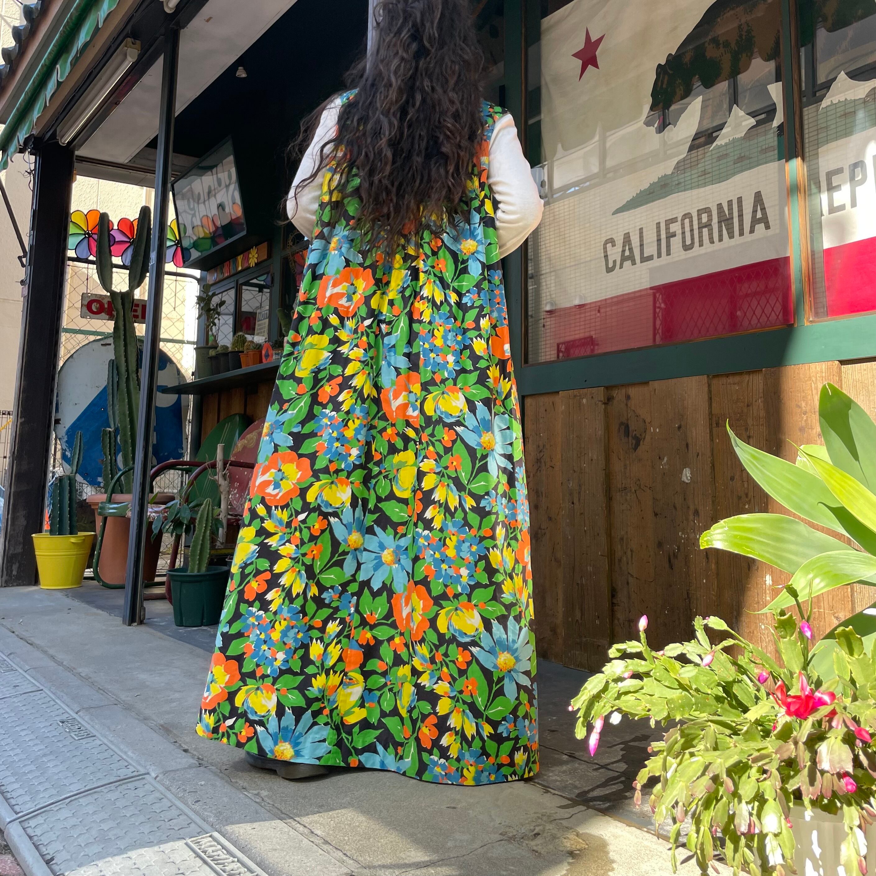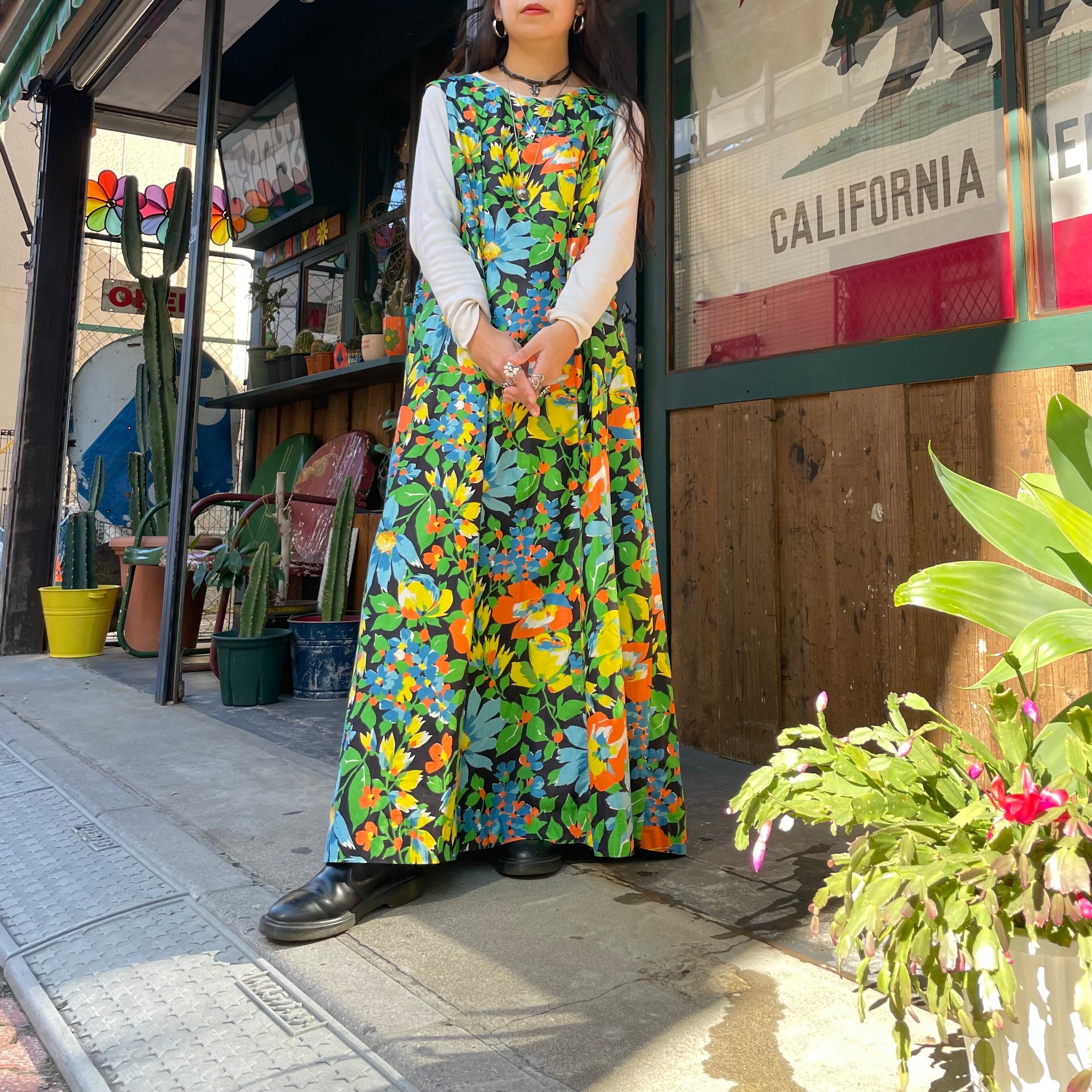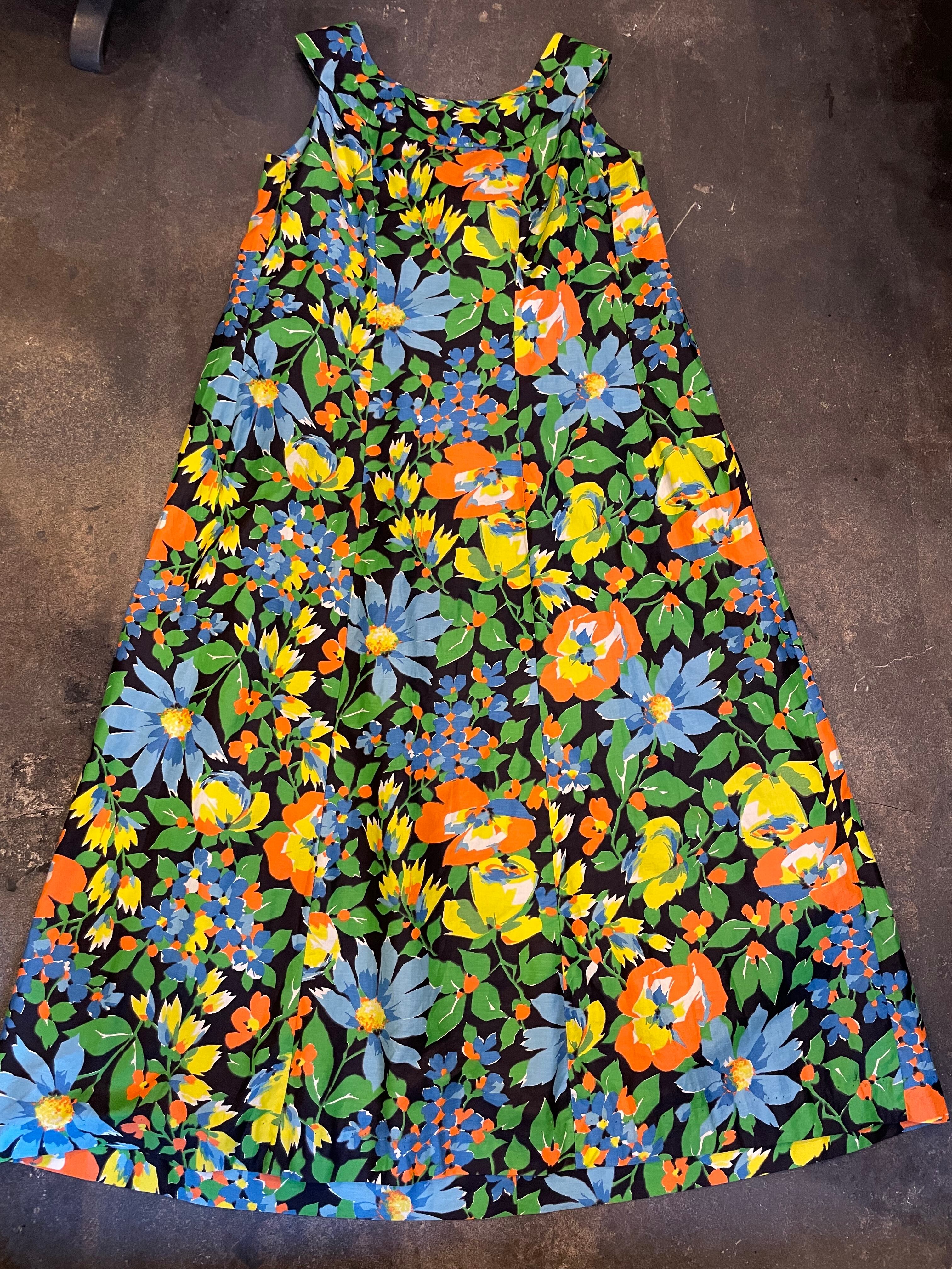 黒ベースにハッピーカラーのお花達がかわいいノースリーブのワンピースです。