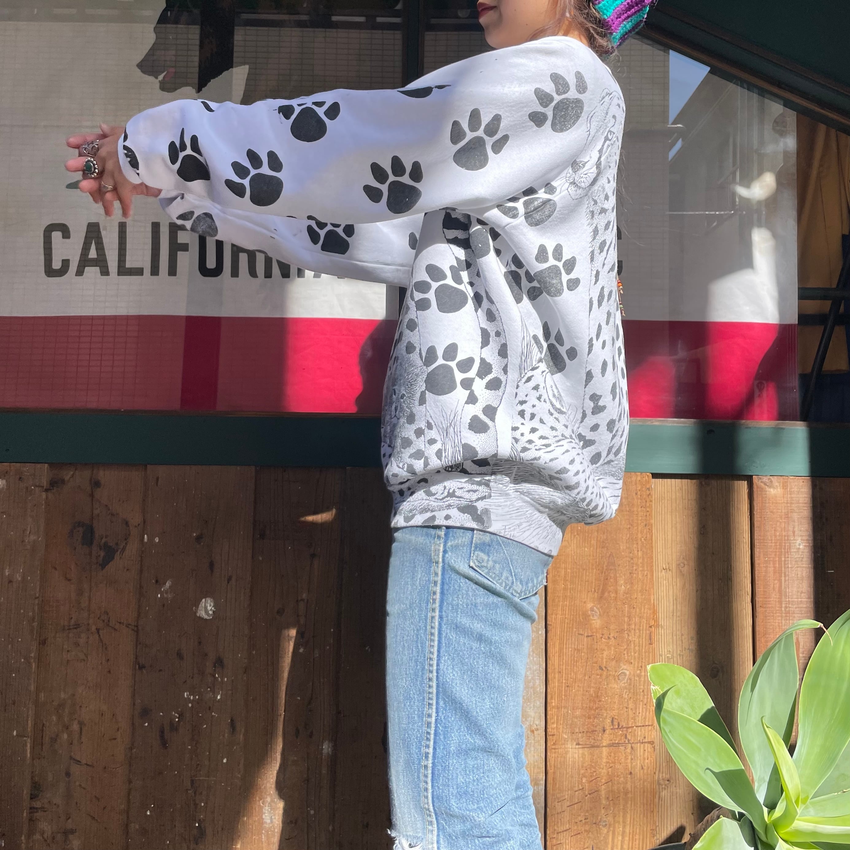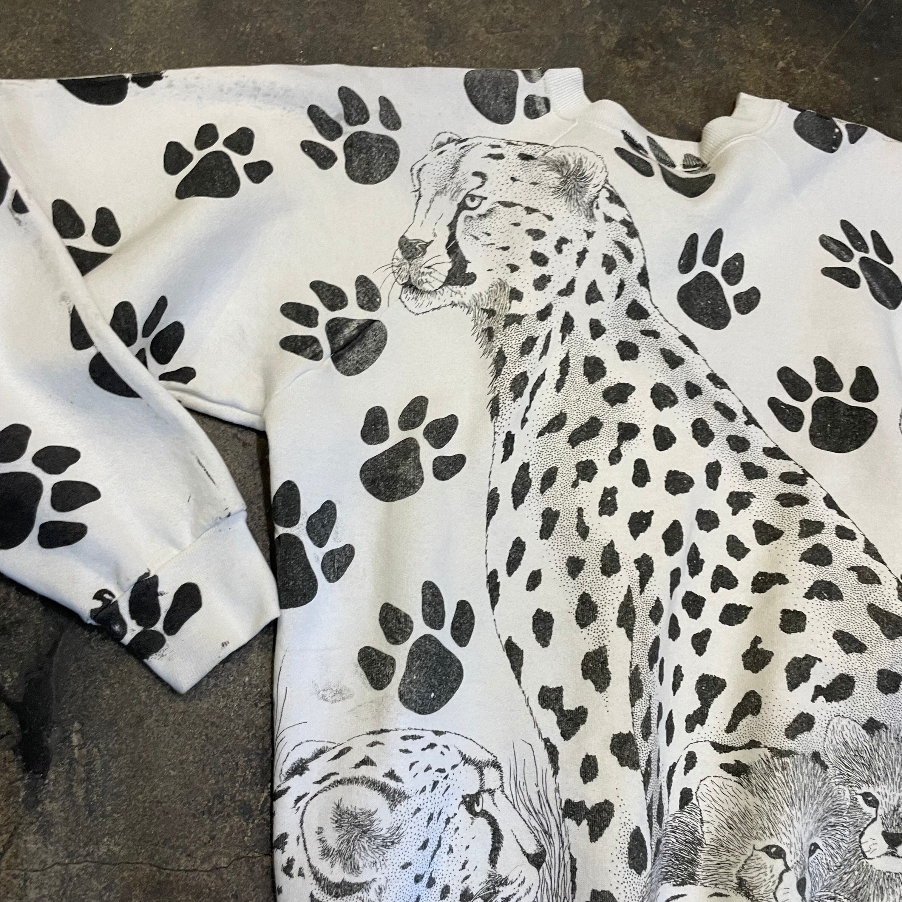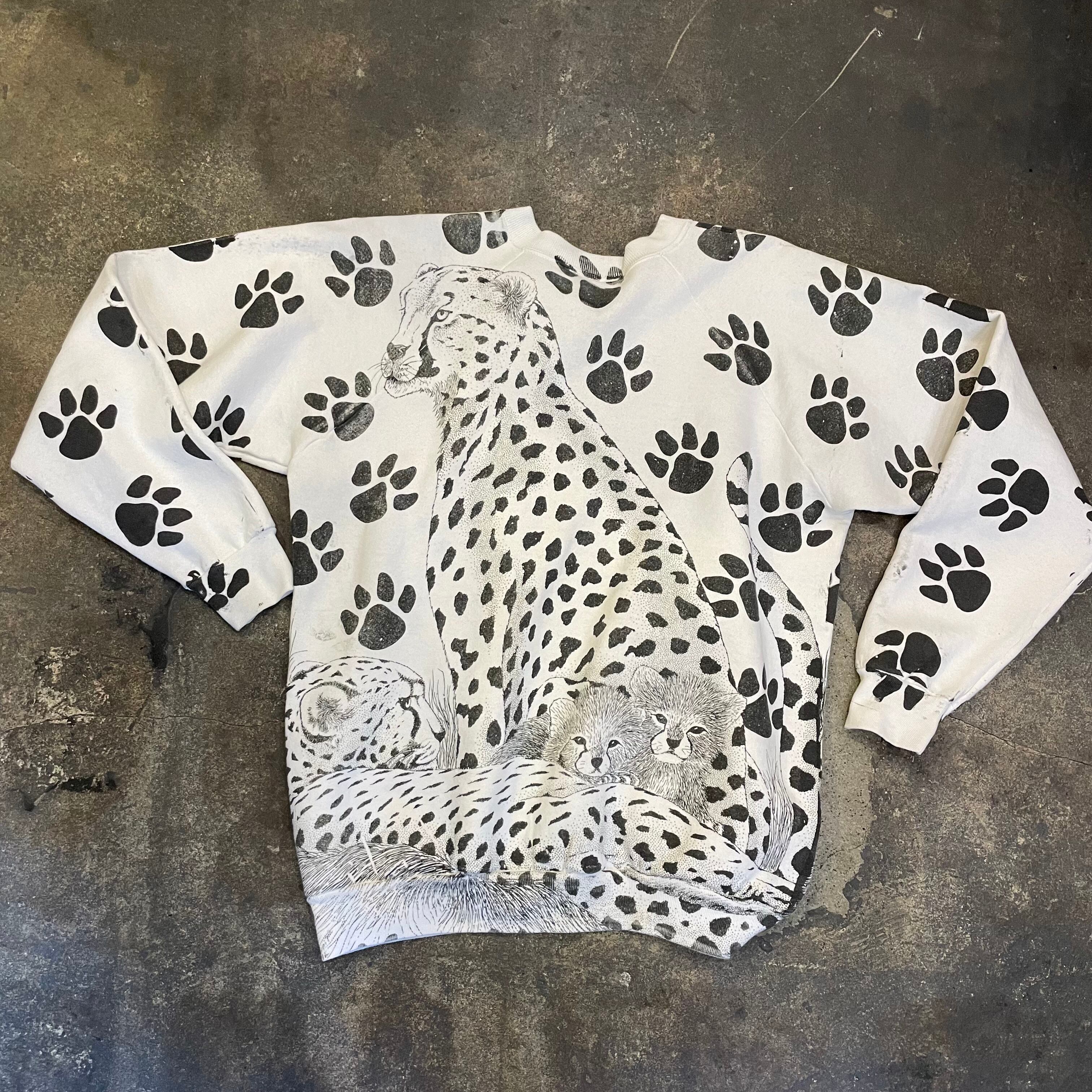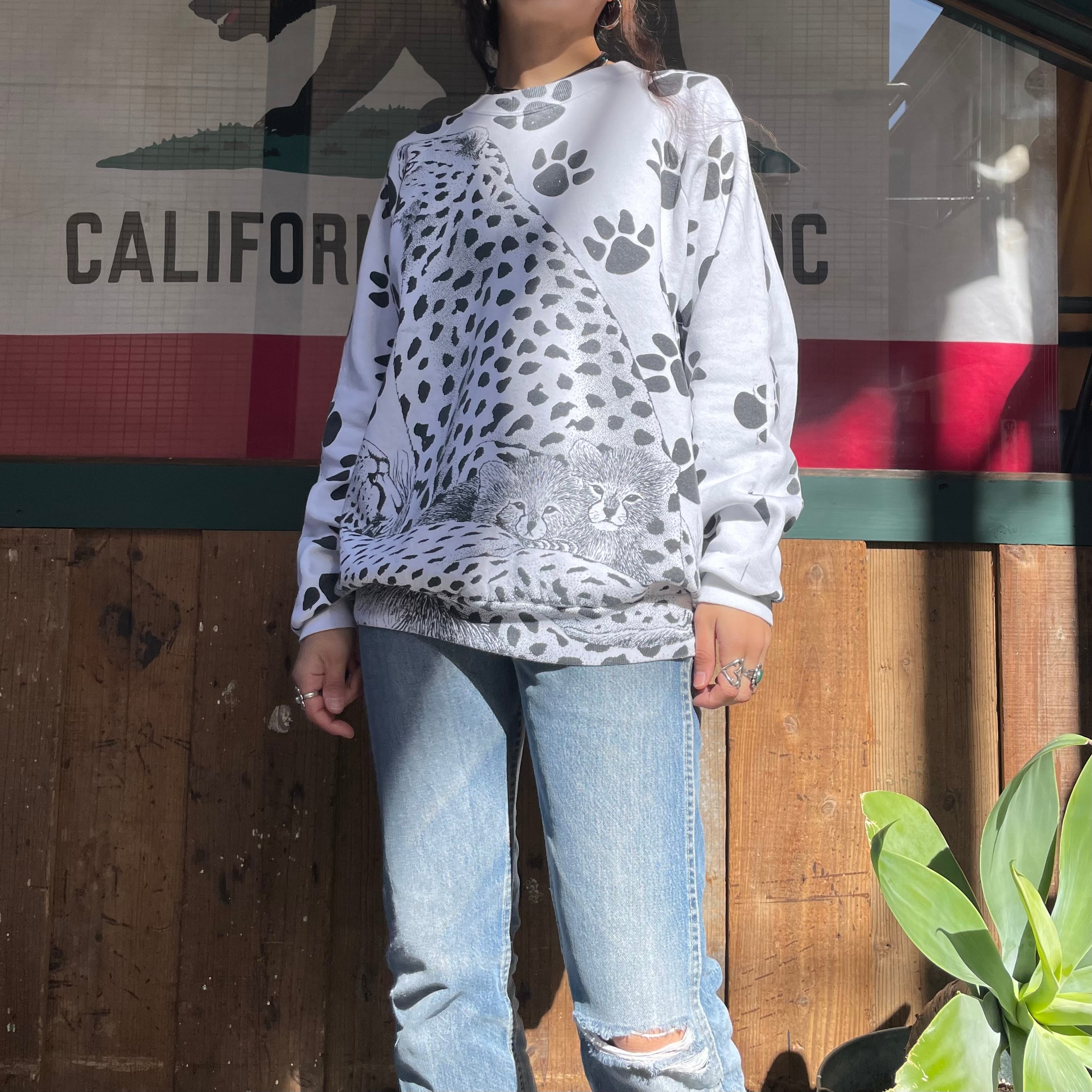 白ボディにヒョウの家族がかわいいスウェットです。背中も袖も全面で贅沢な一枚ですね。