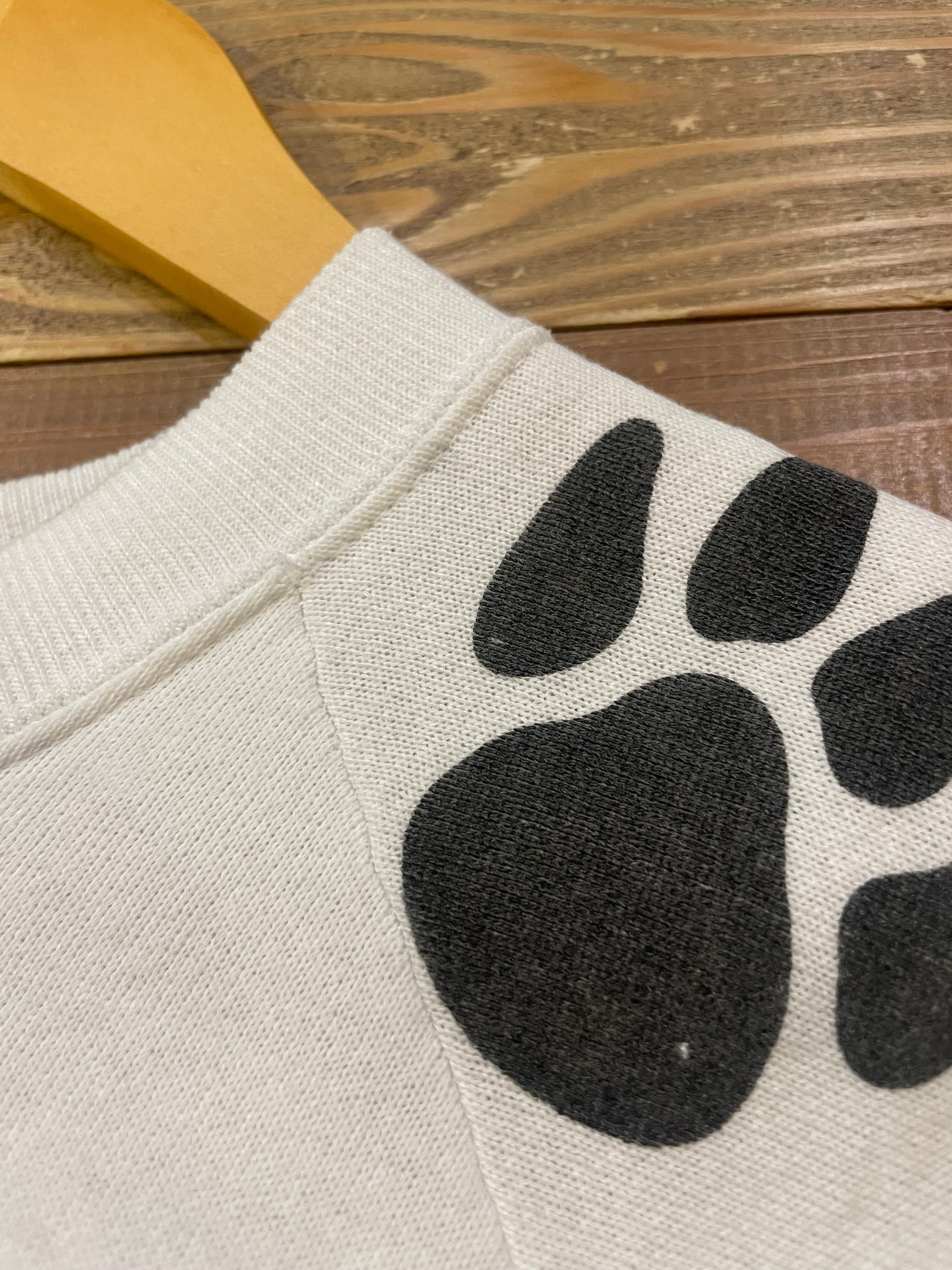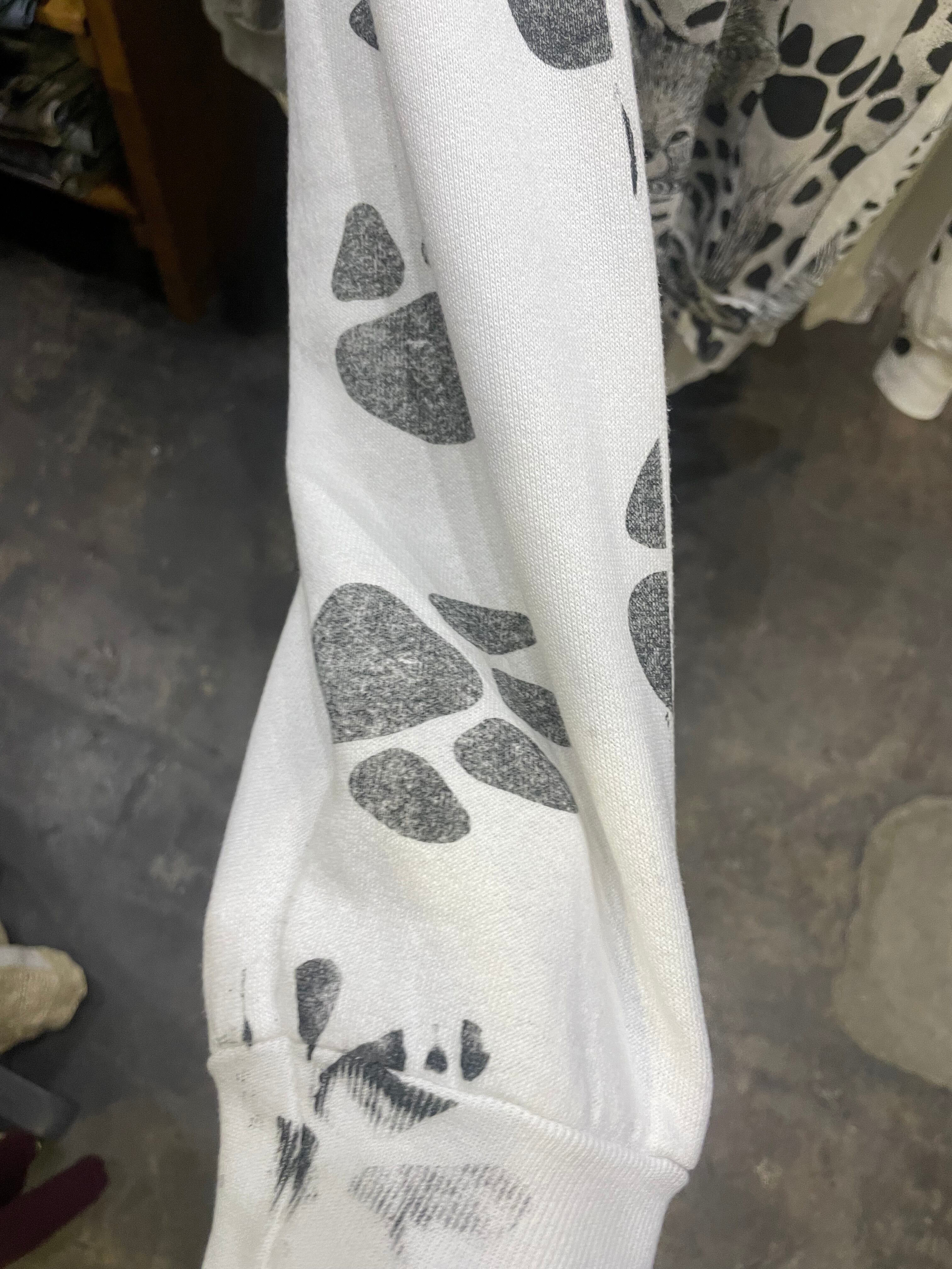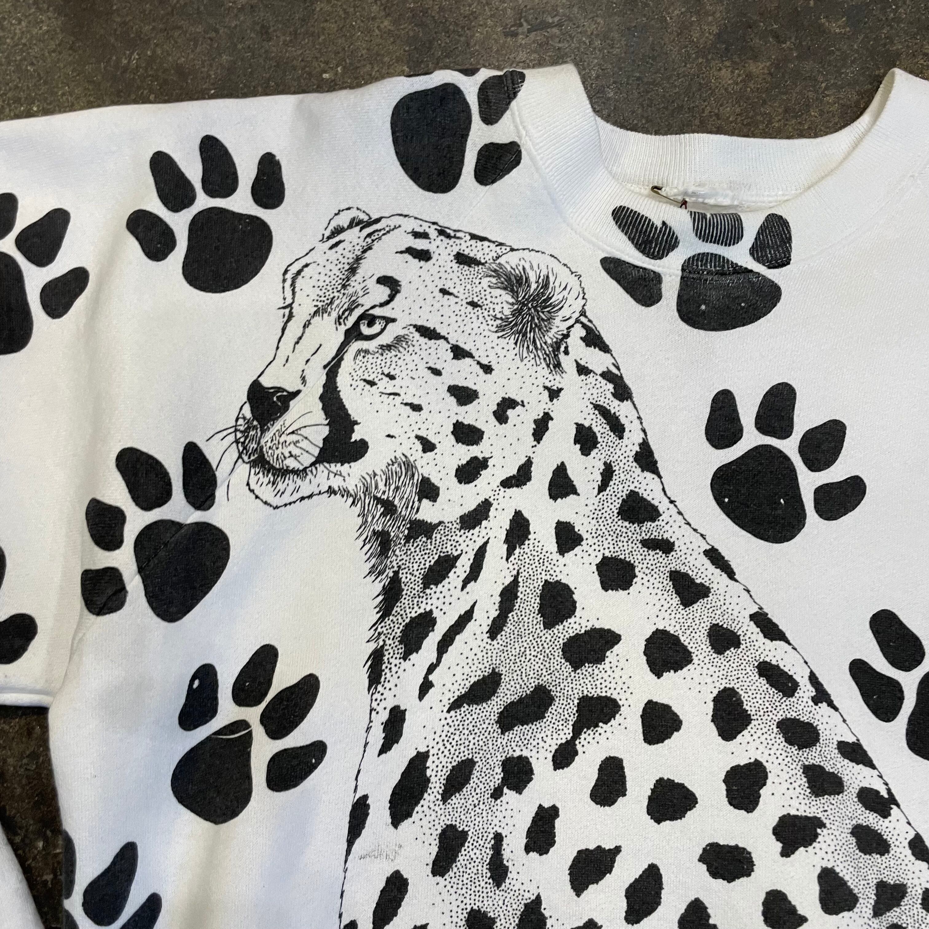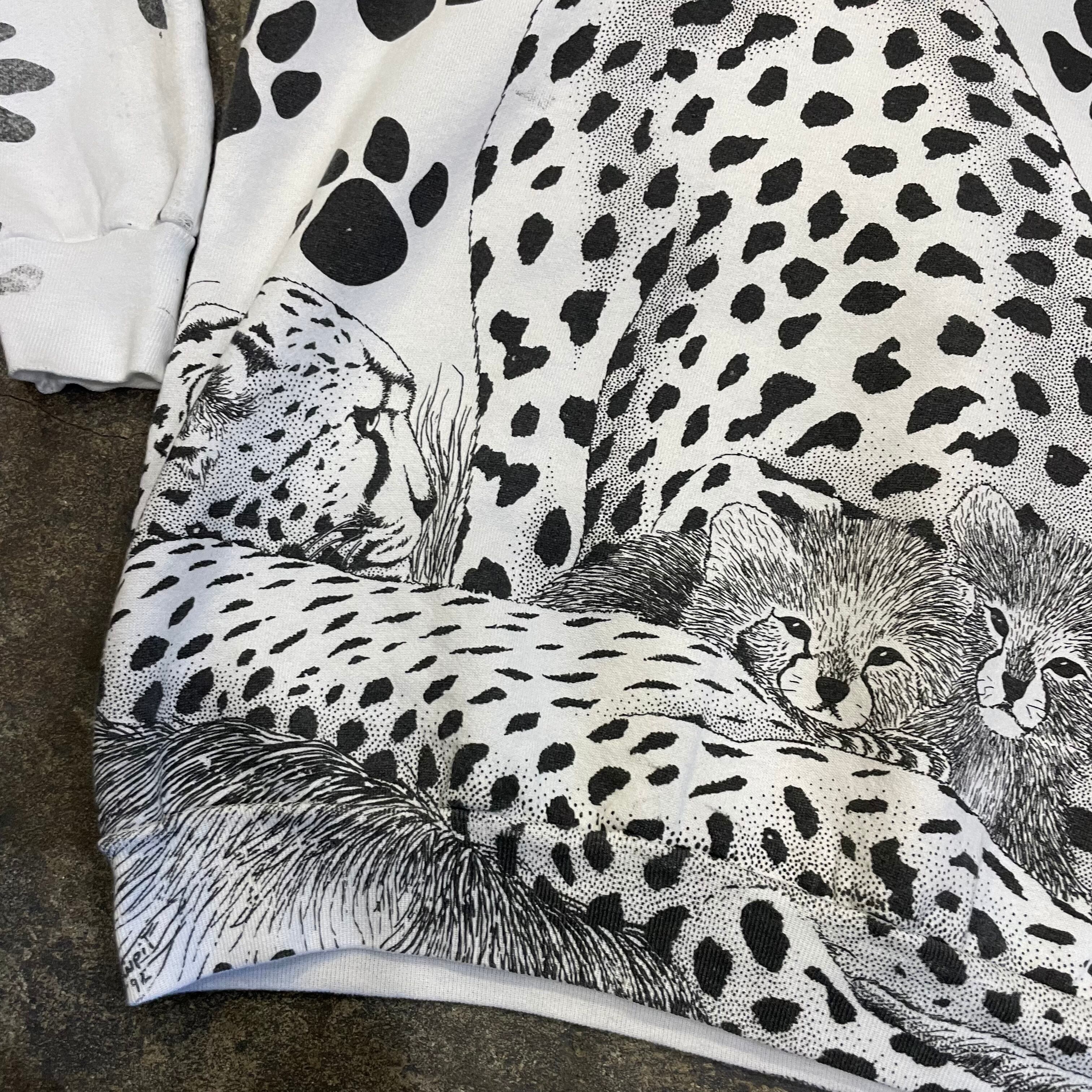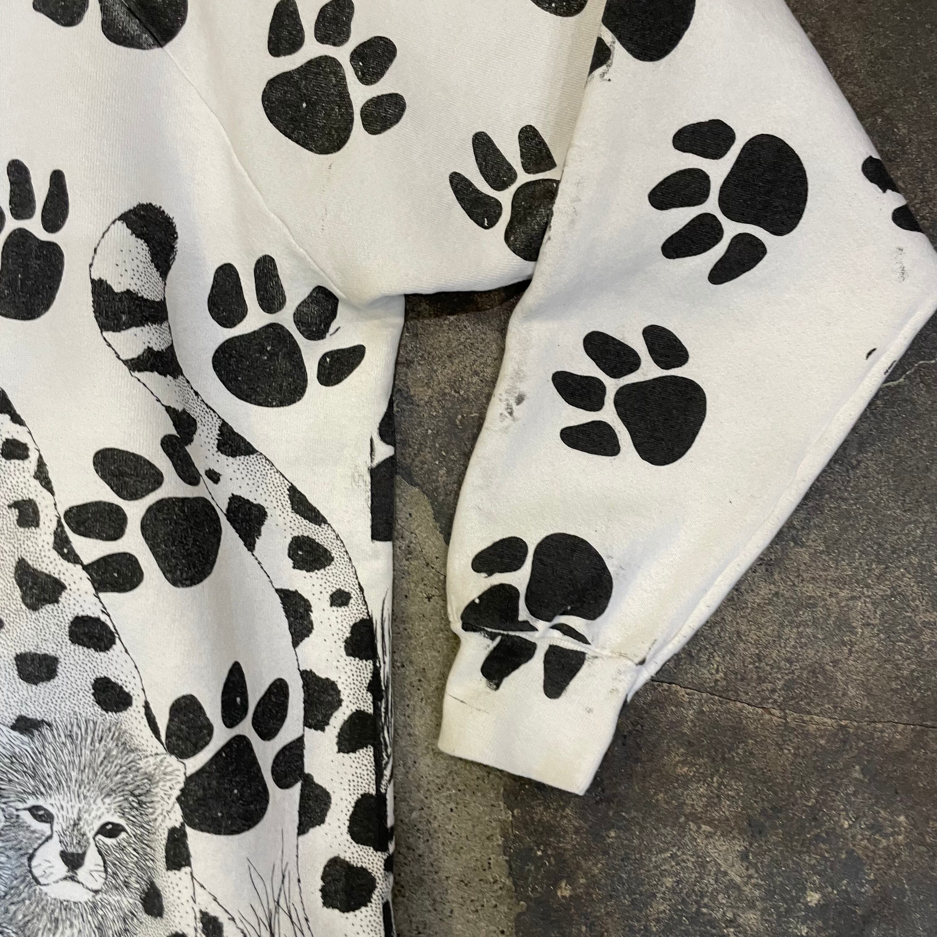 白ボディにヒョウの家族がかわいいスウェットです。背中も袖も全面で贅沢な一枚ですね。