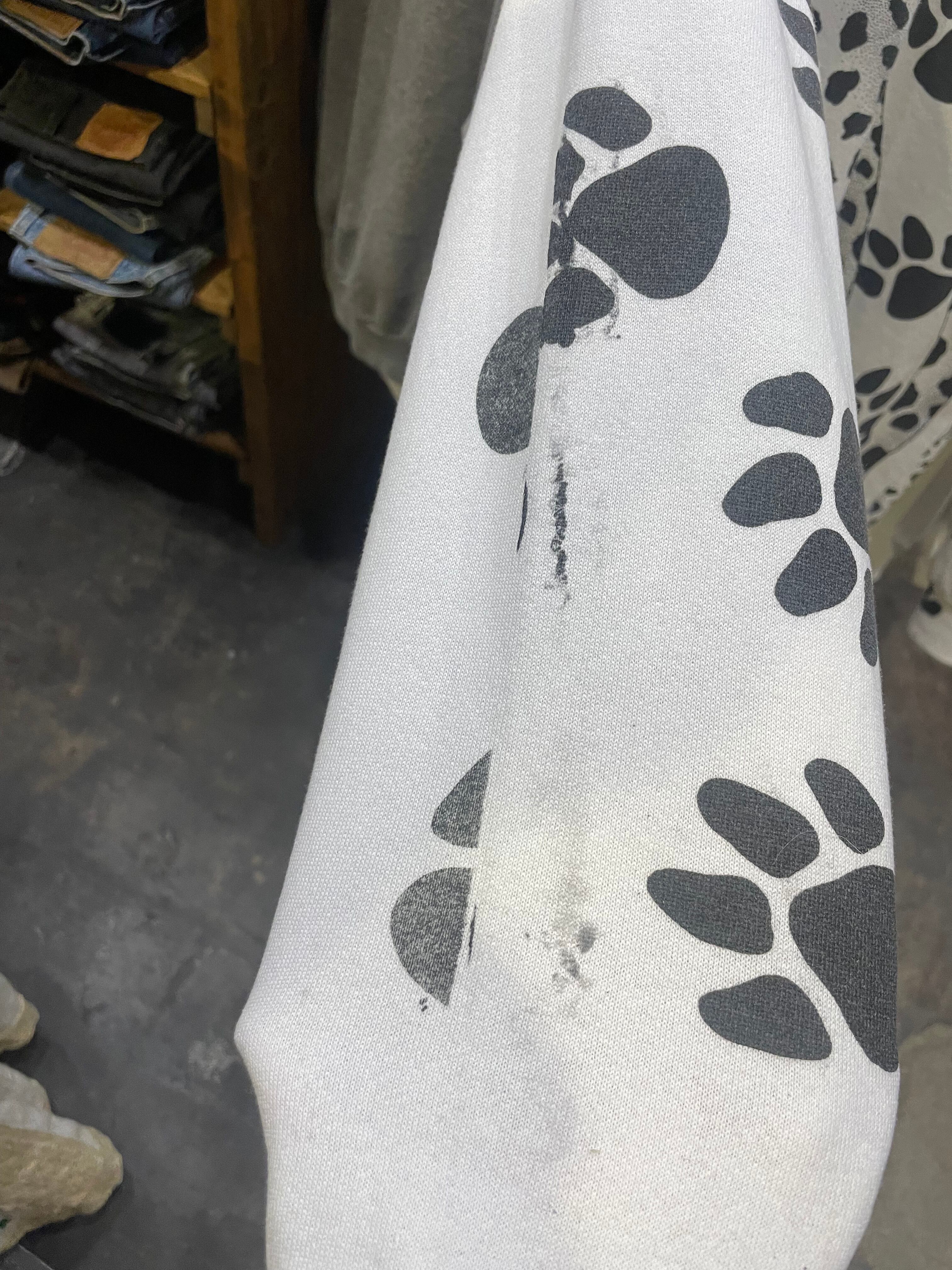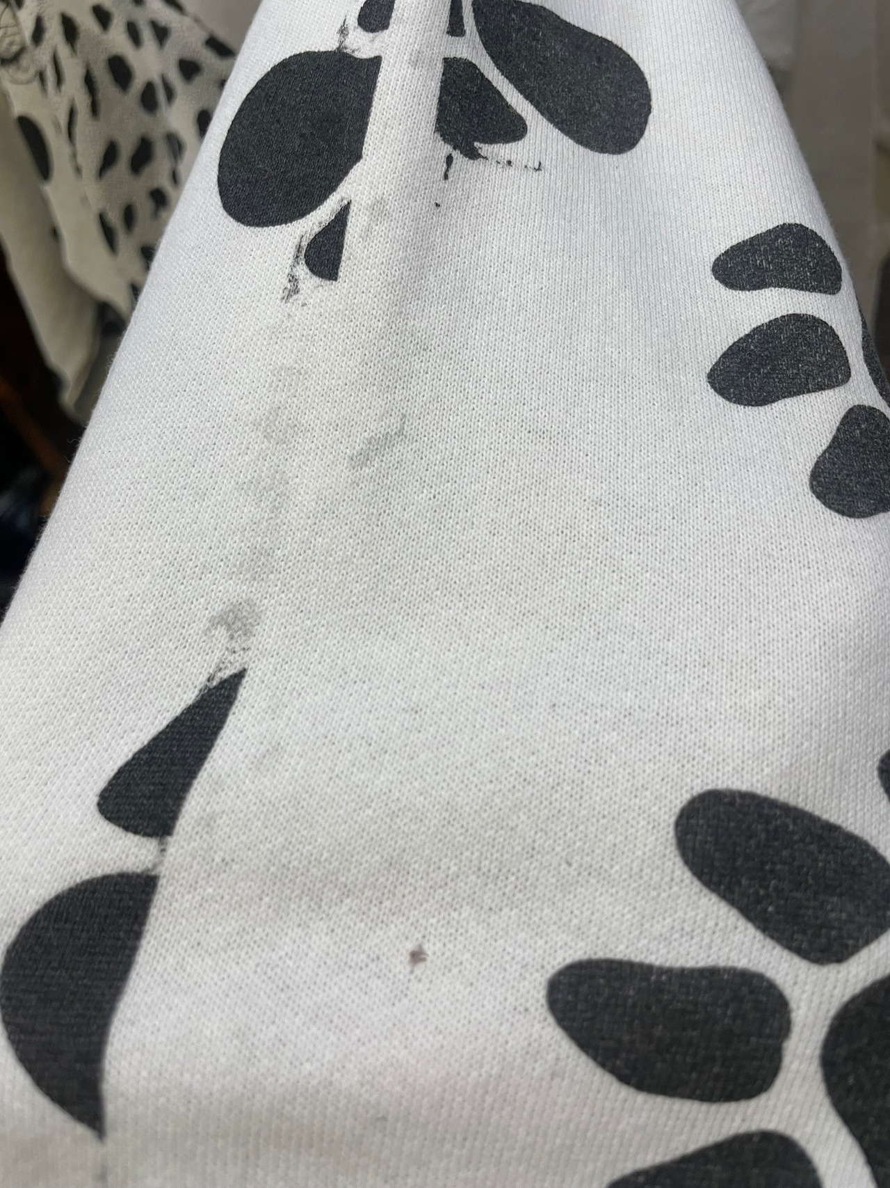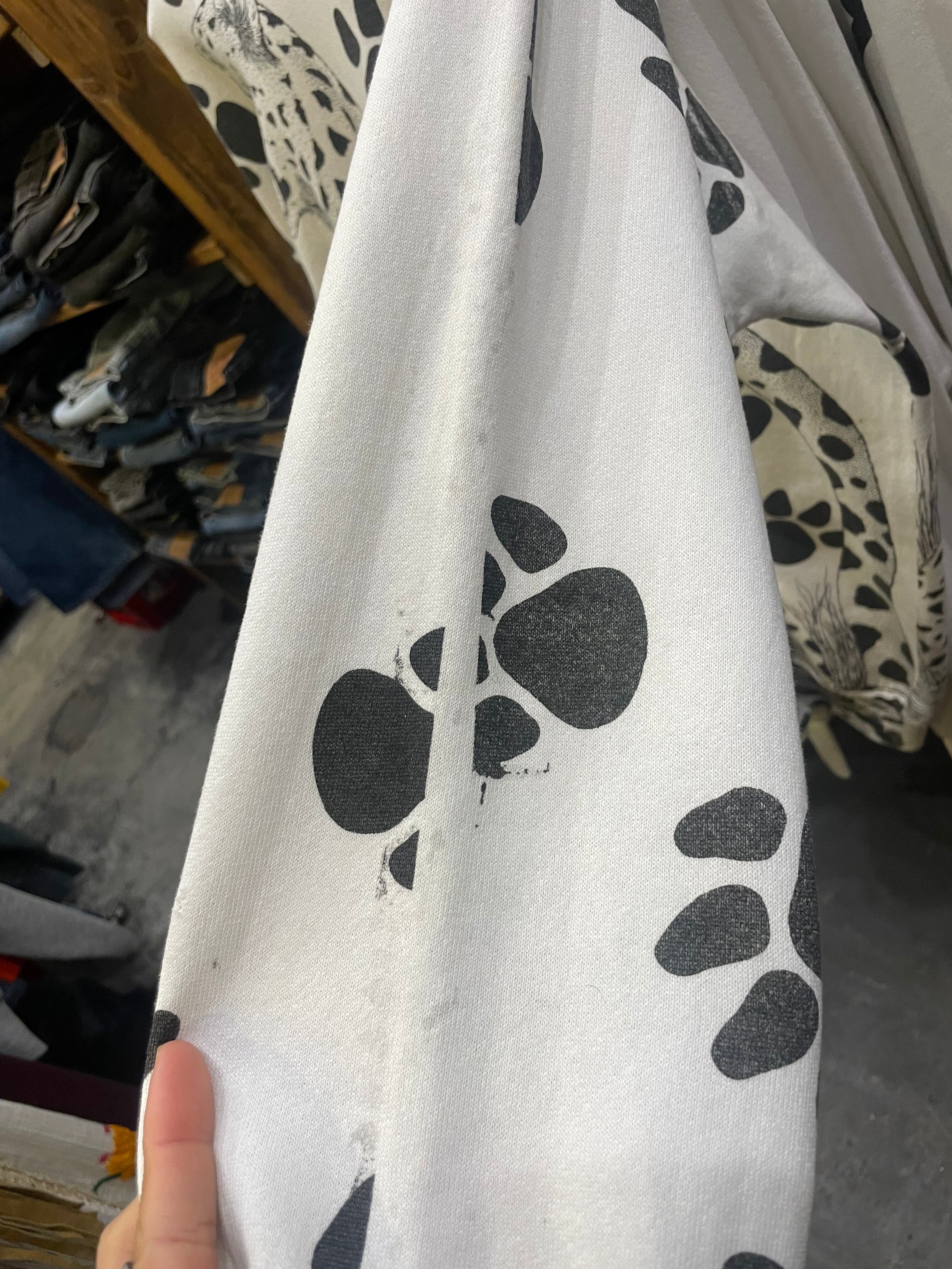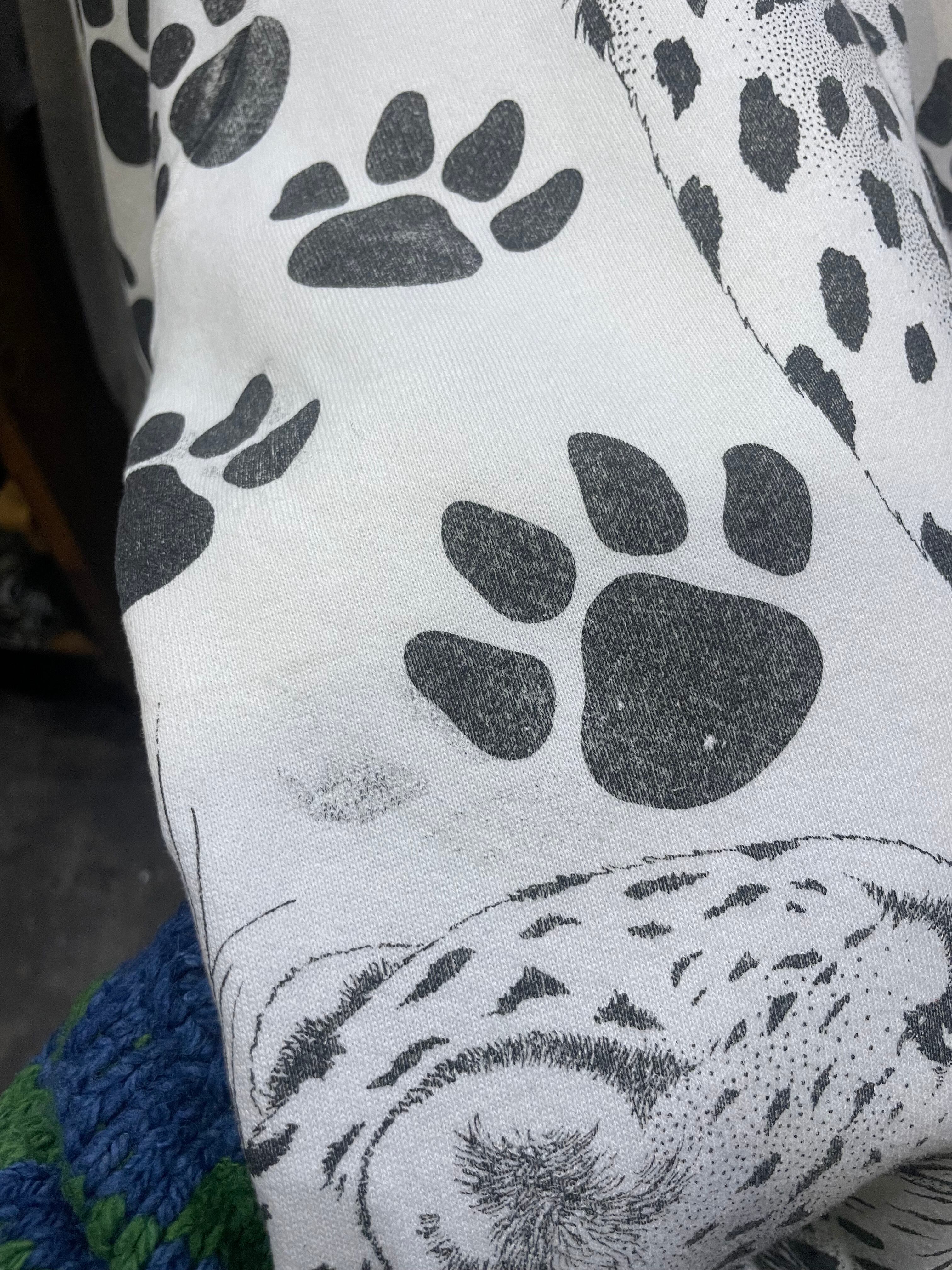 白ボディにヒョウの家族がかわいいスウェットです。背中も袖も全面で贅沢な一枚ですね。