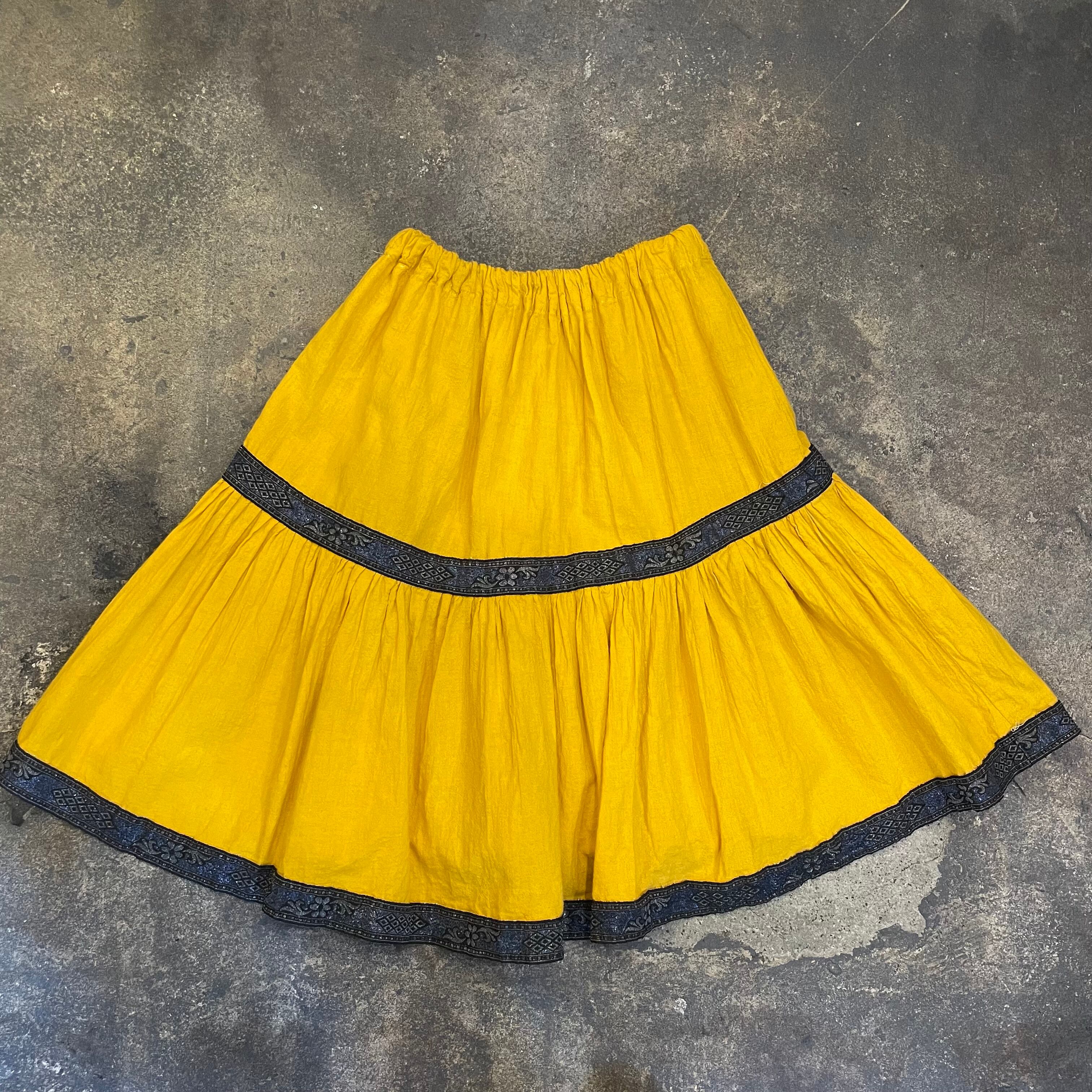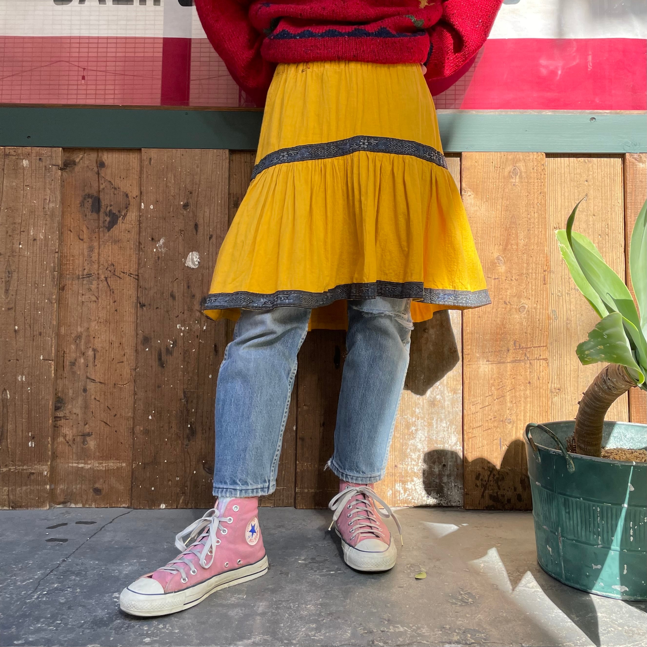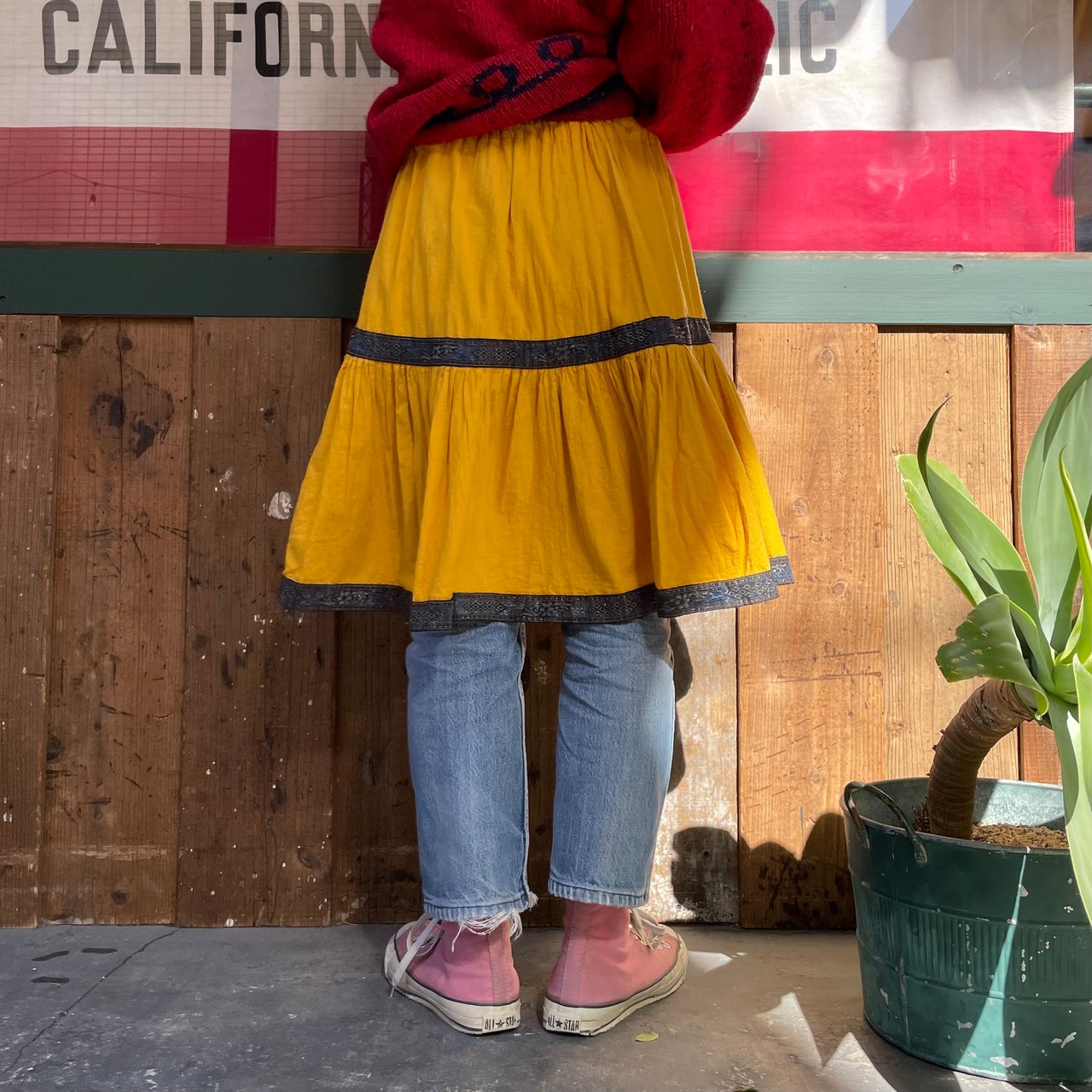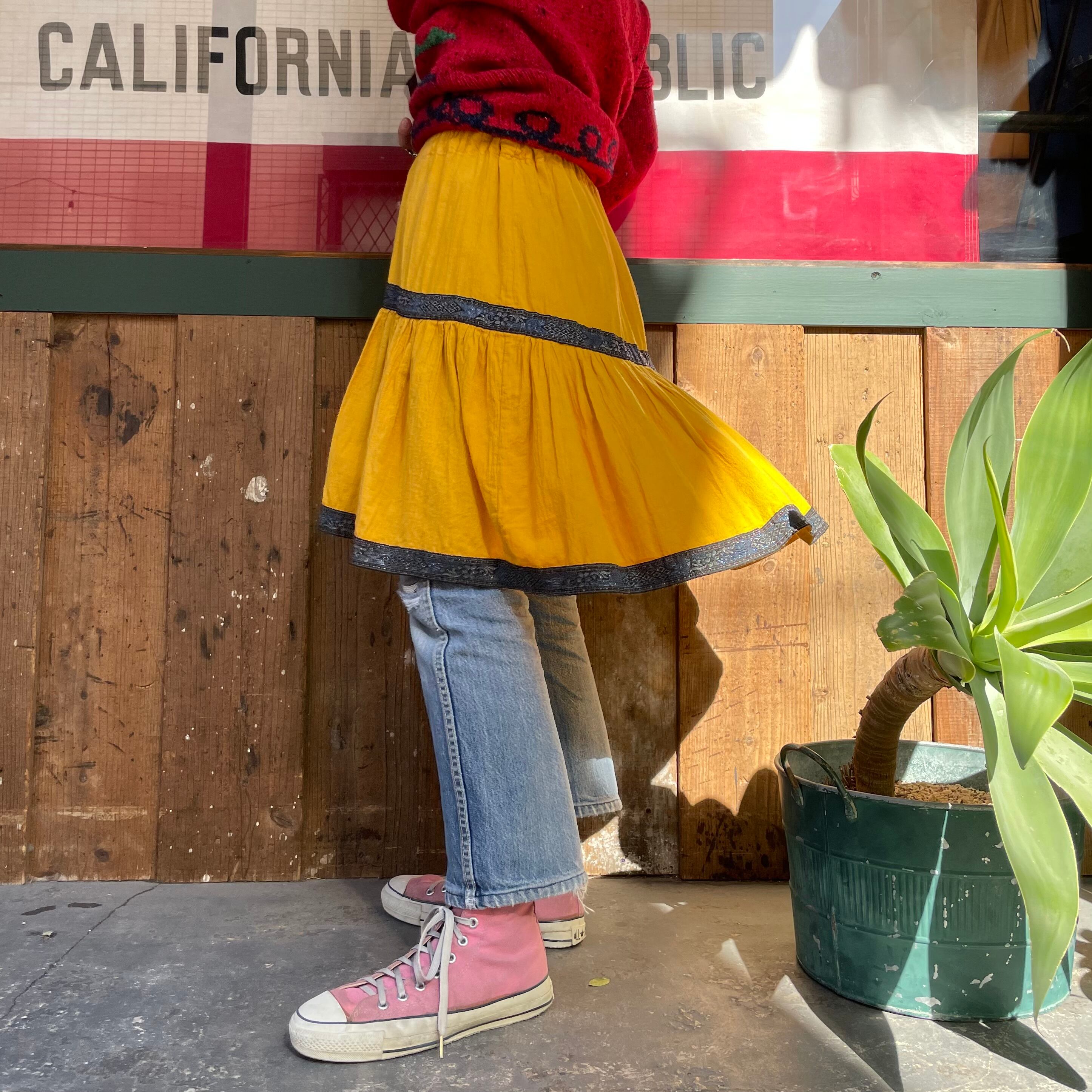 マスタードカラーの落ち着いた黄色が合わせやすいスカートです。
