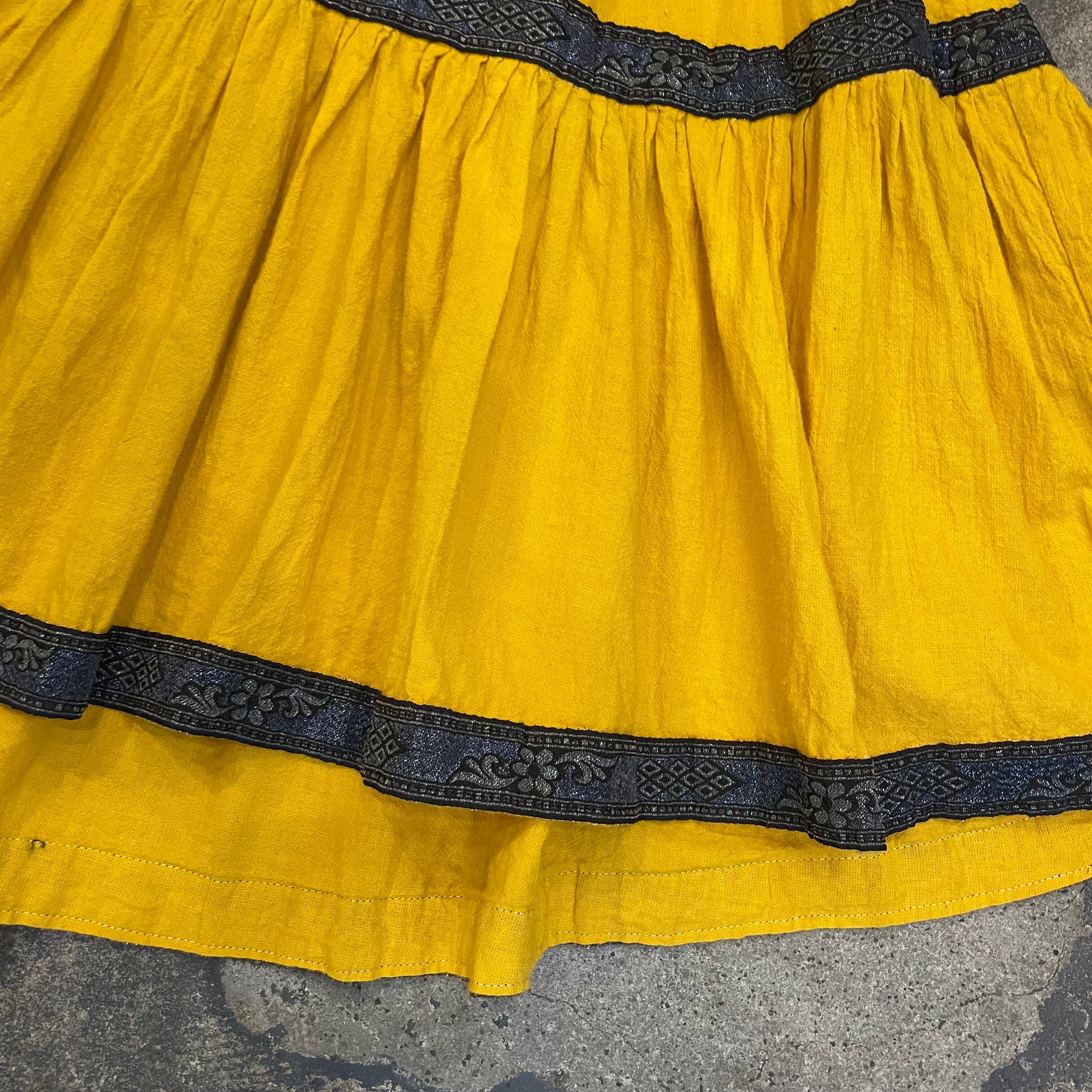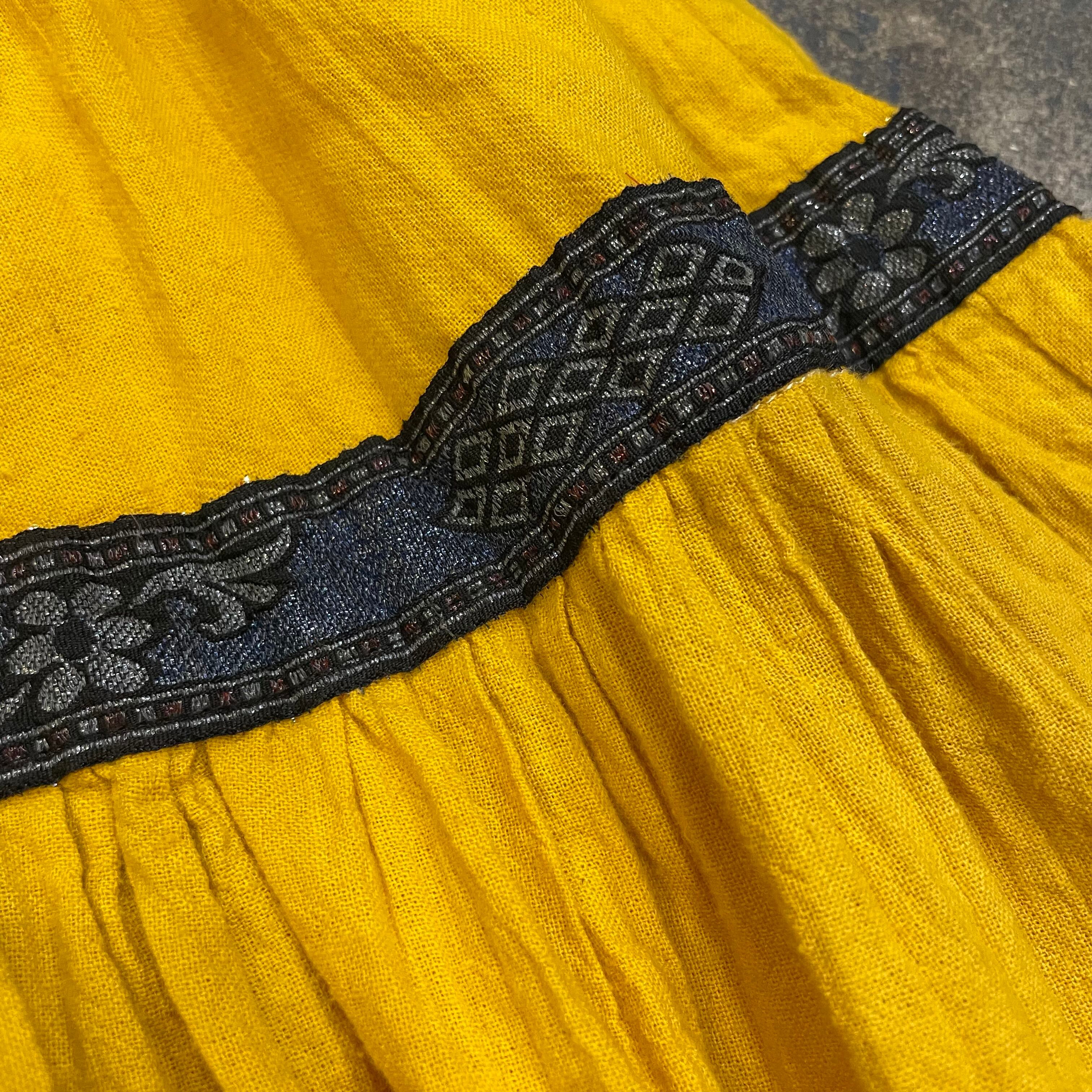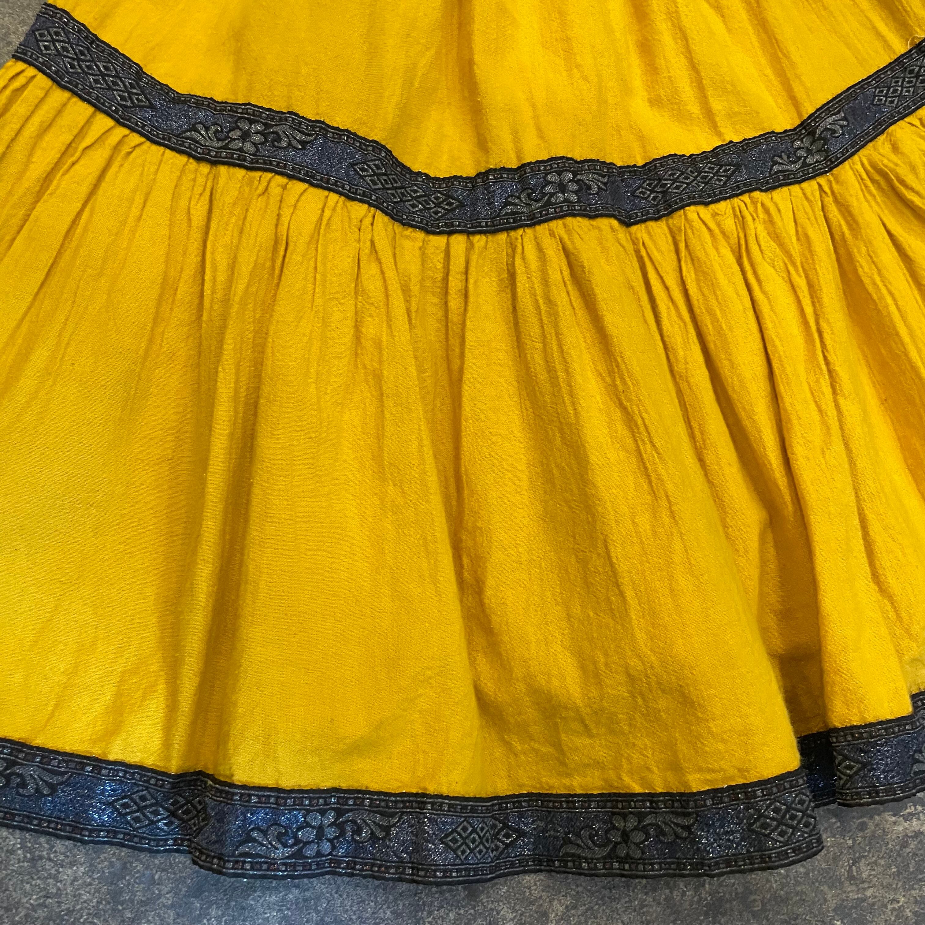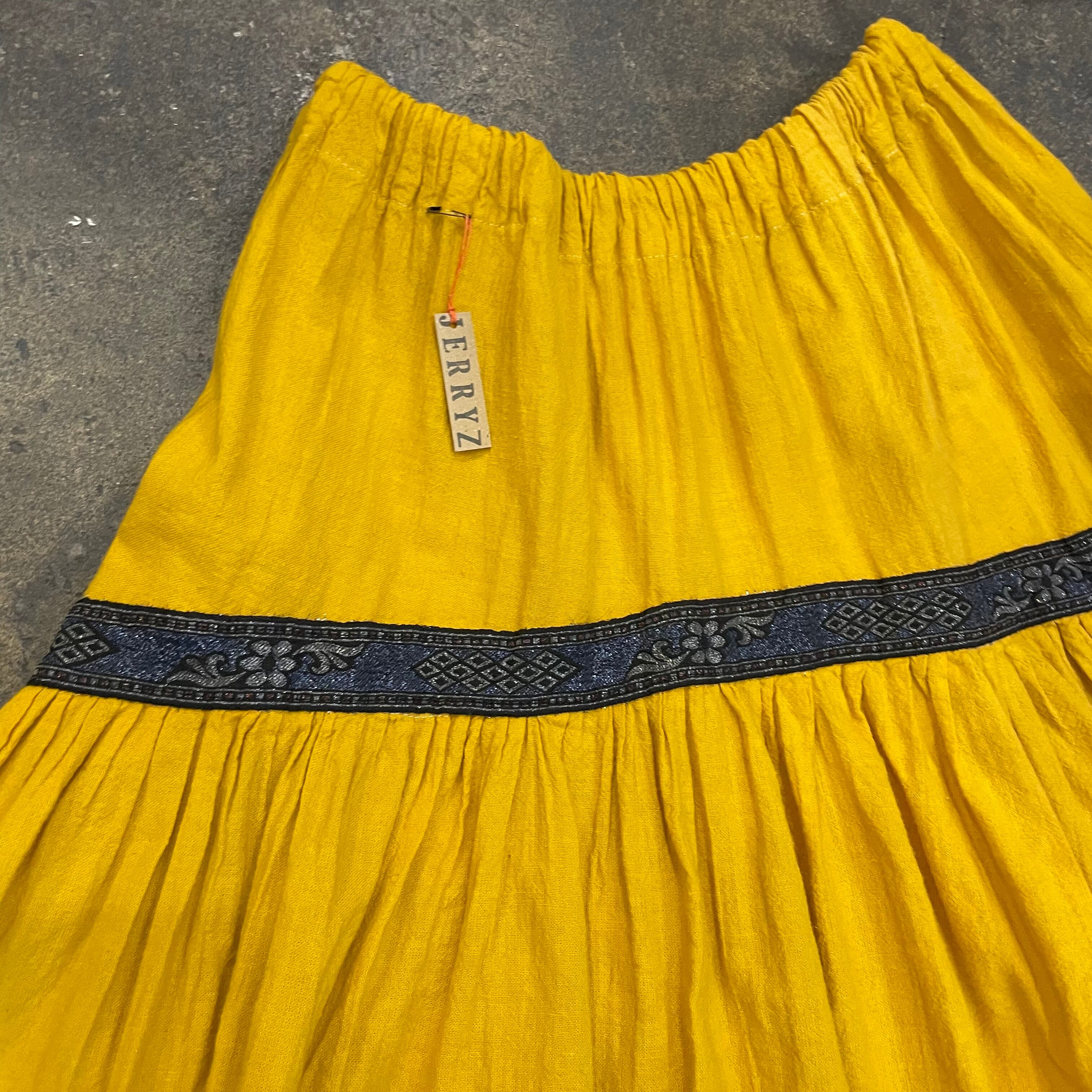 マスタードカラーの落ち着いた黄色が合わせやすいスカートです。