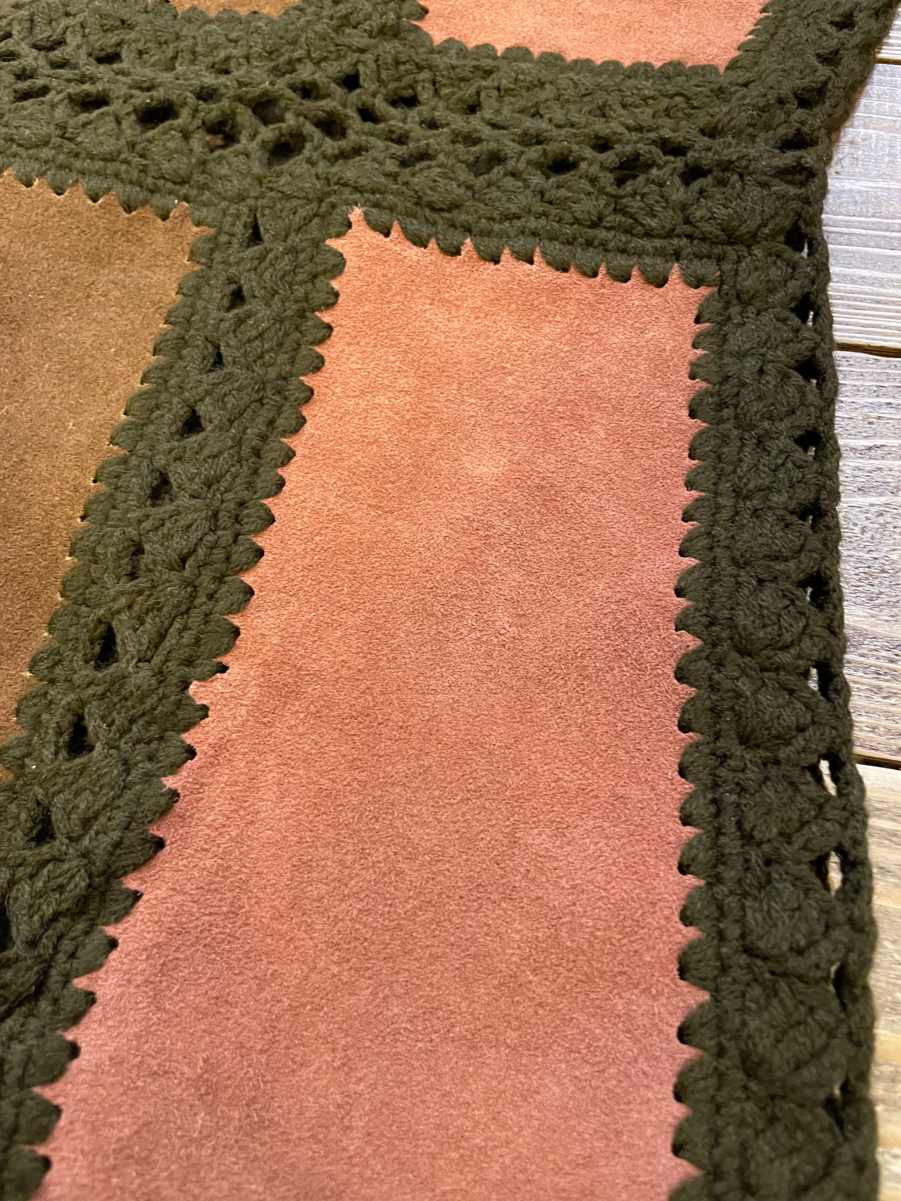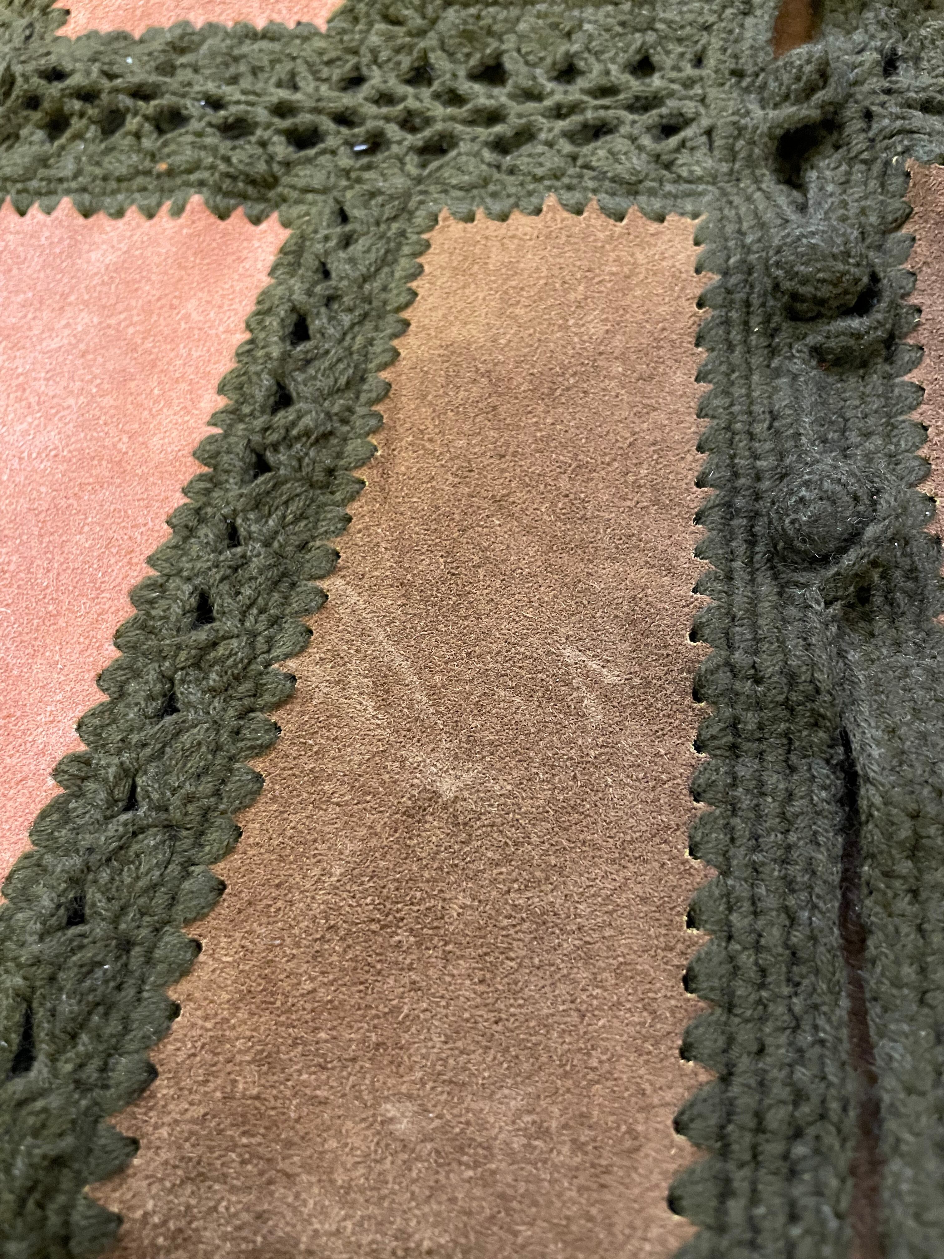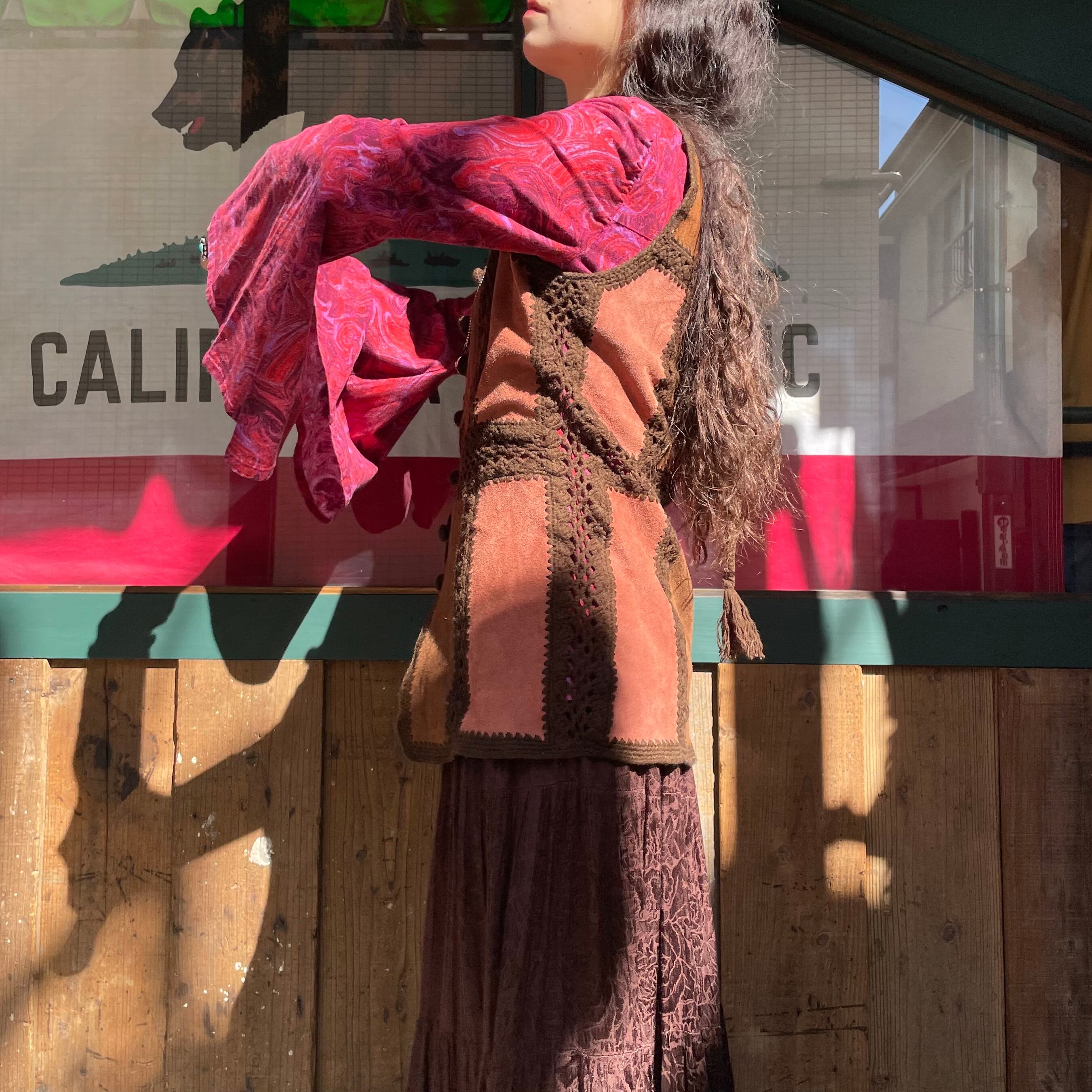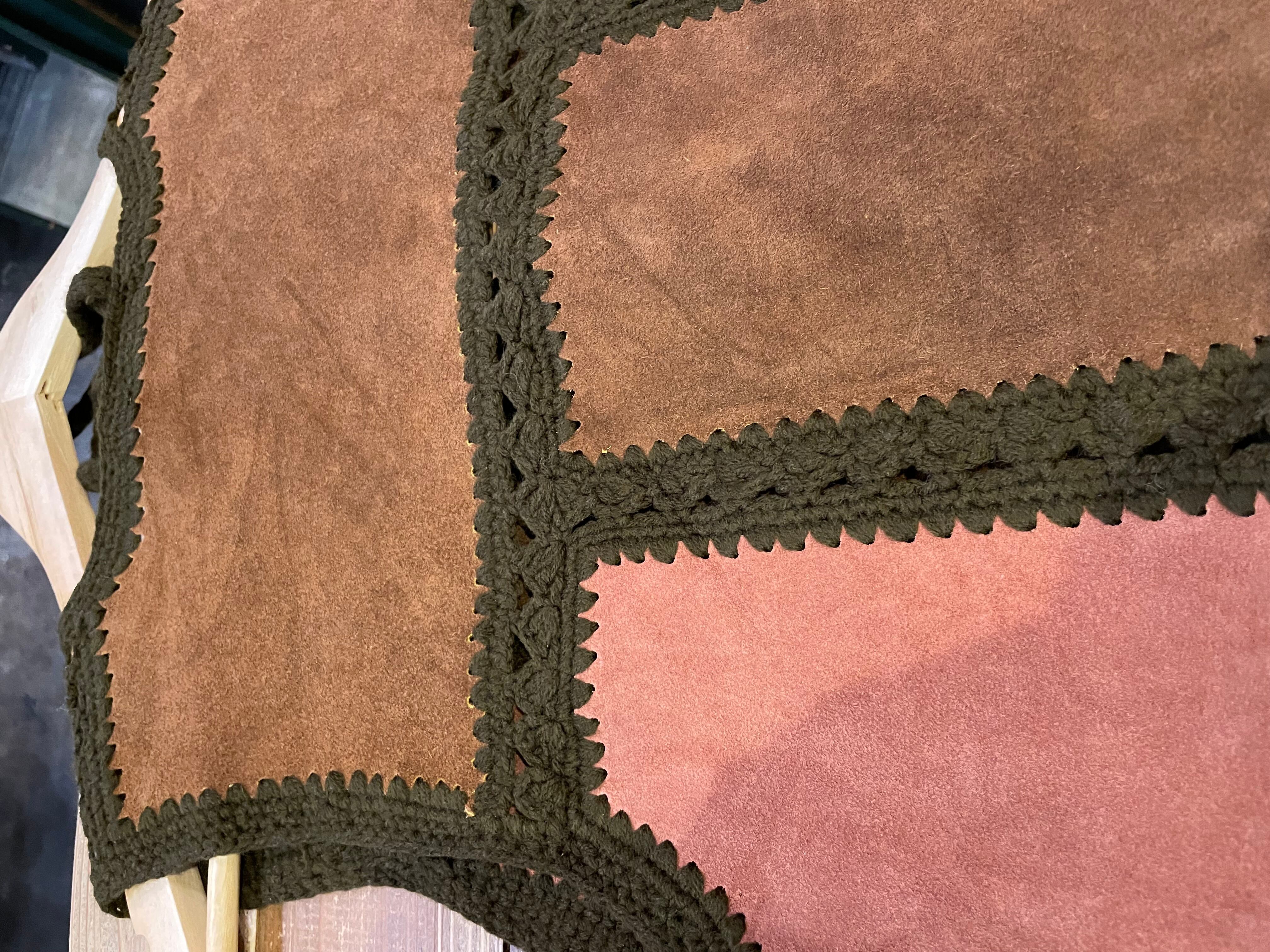 薄手のスエードのパーツをかぎ針編みで繋いでいて、柔らかく着心地もよいですしヒッピーな雰囲気がとてもかわいいですね。