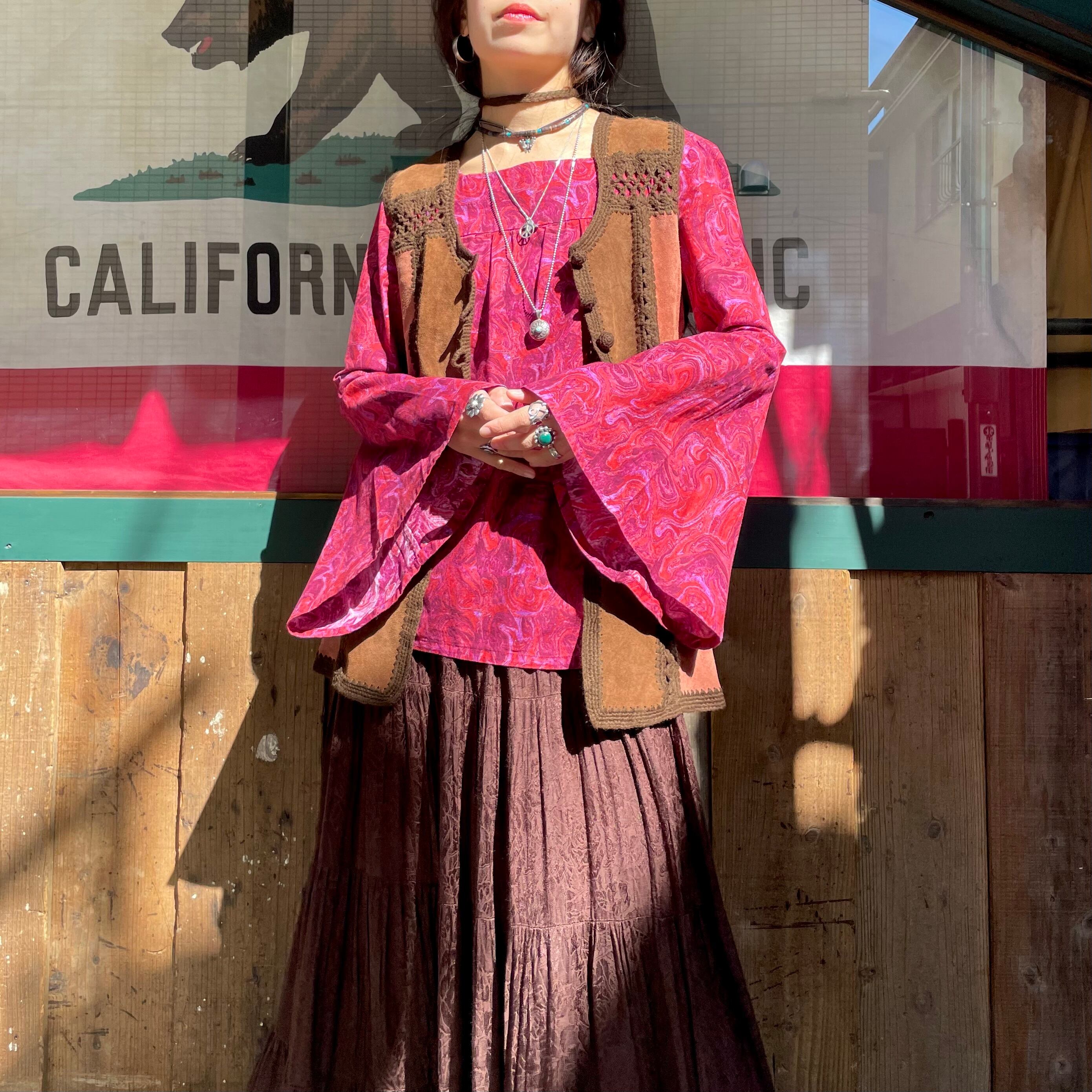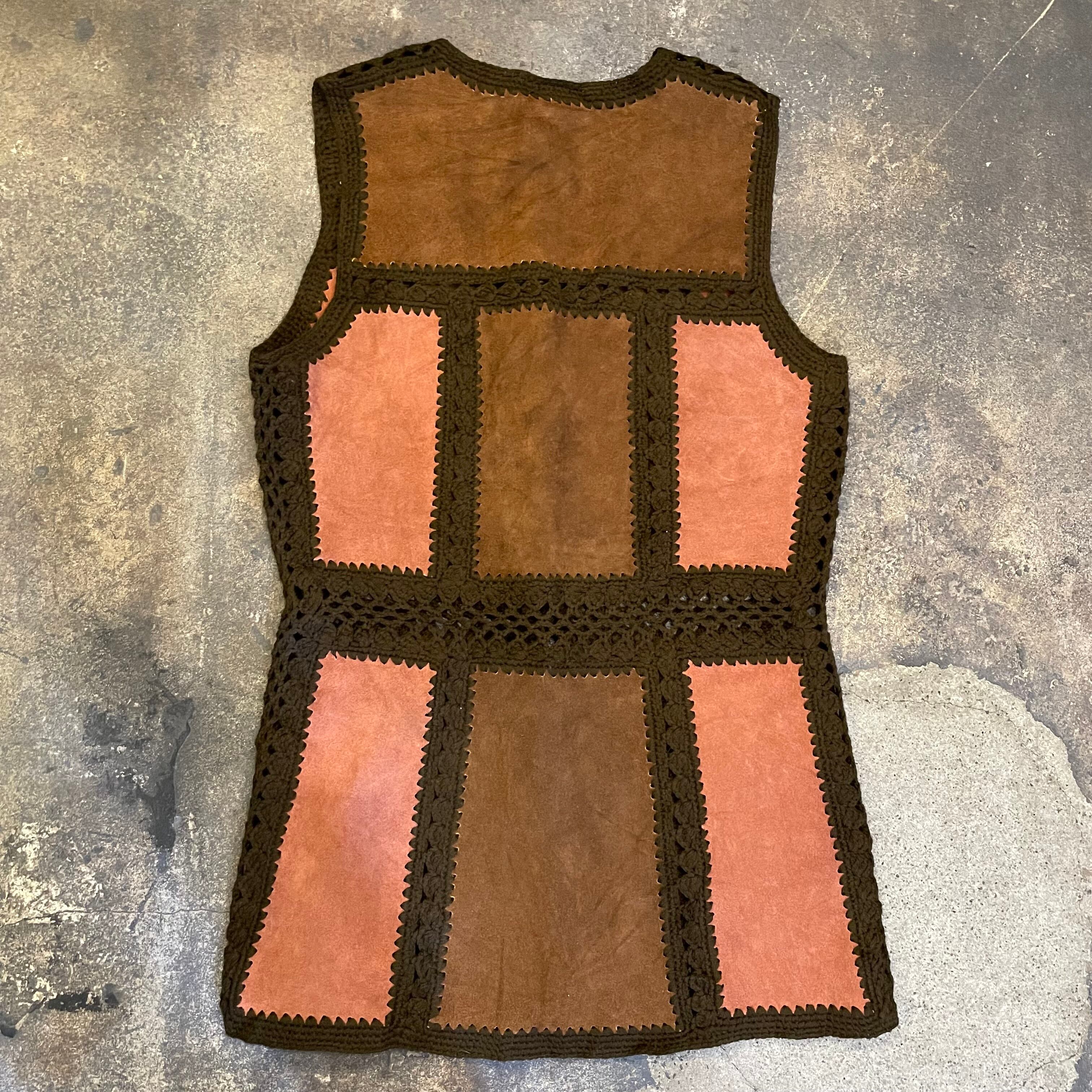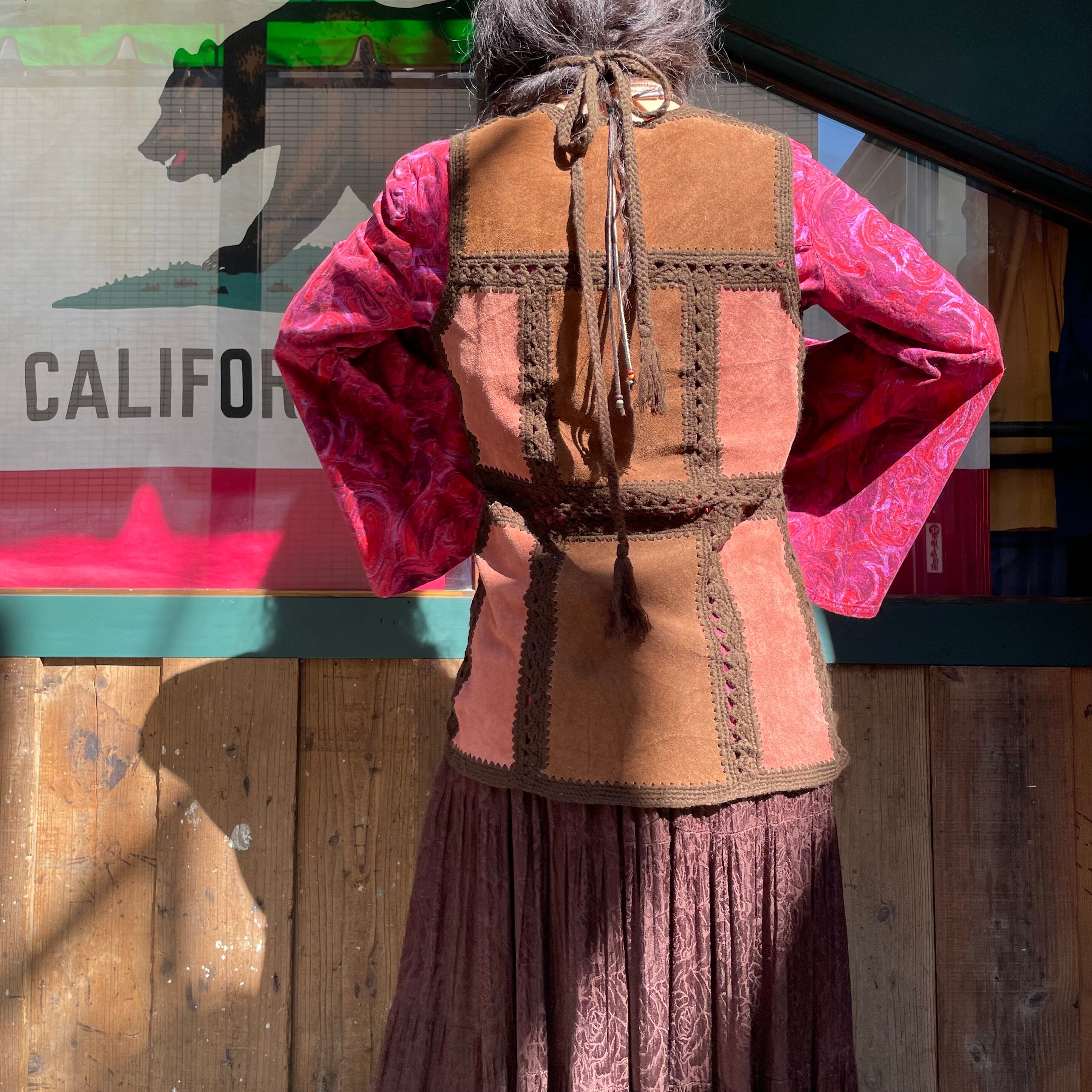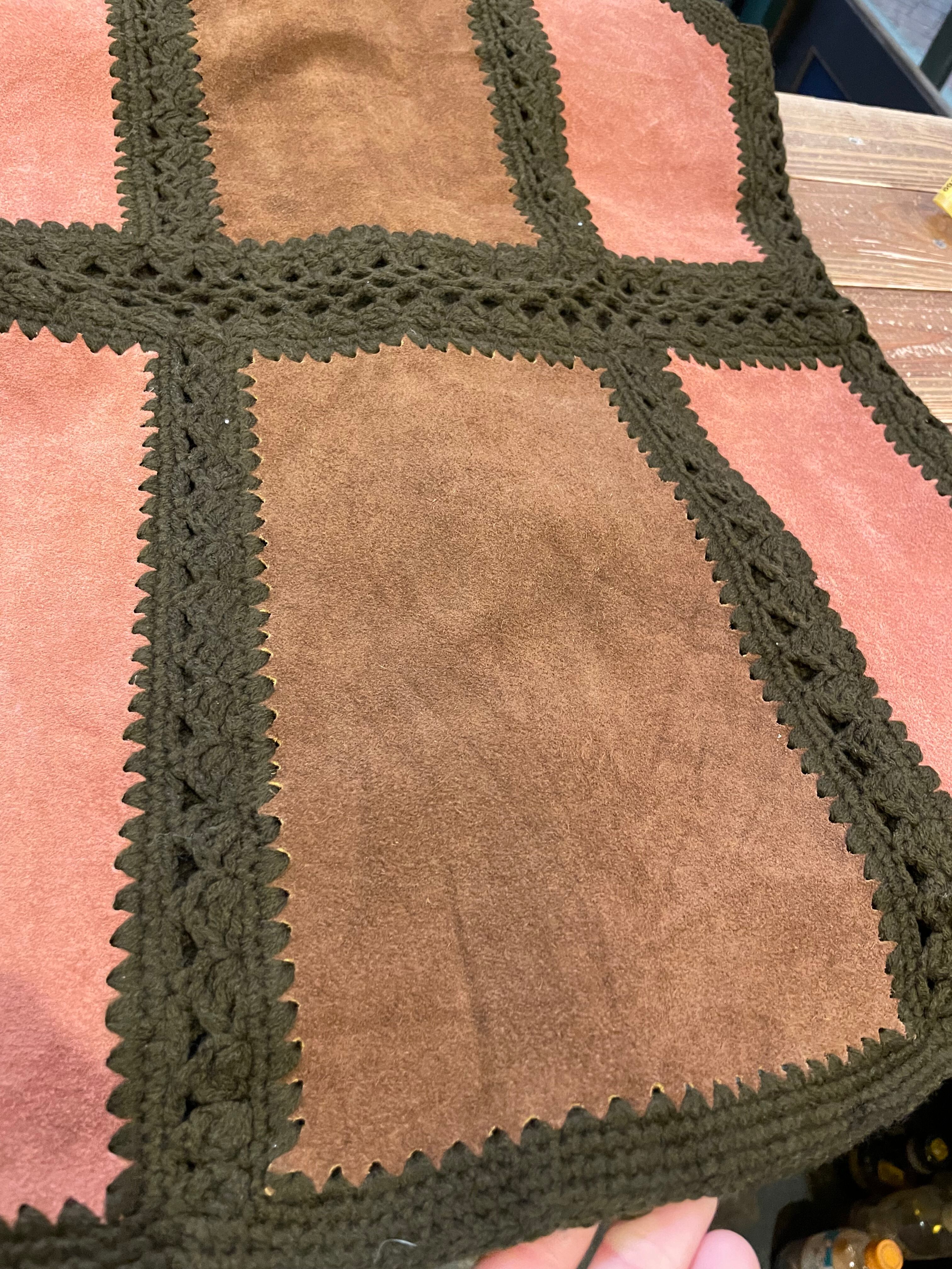 薄手のスエードのパーツをかぎ針編みで繋いでいて、柔らかく着心地もよいですしヒッピーな雰囲気がとてもかわいいですね。