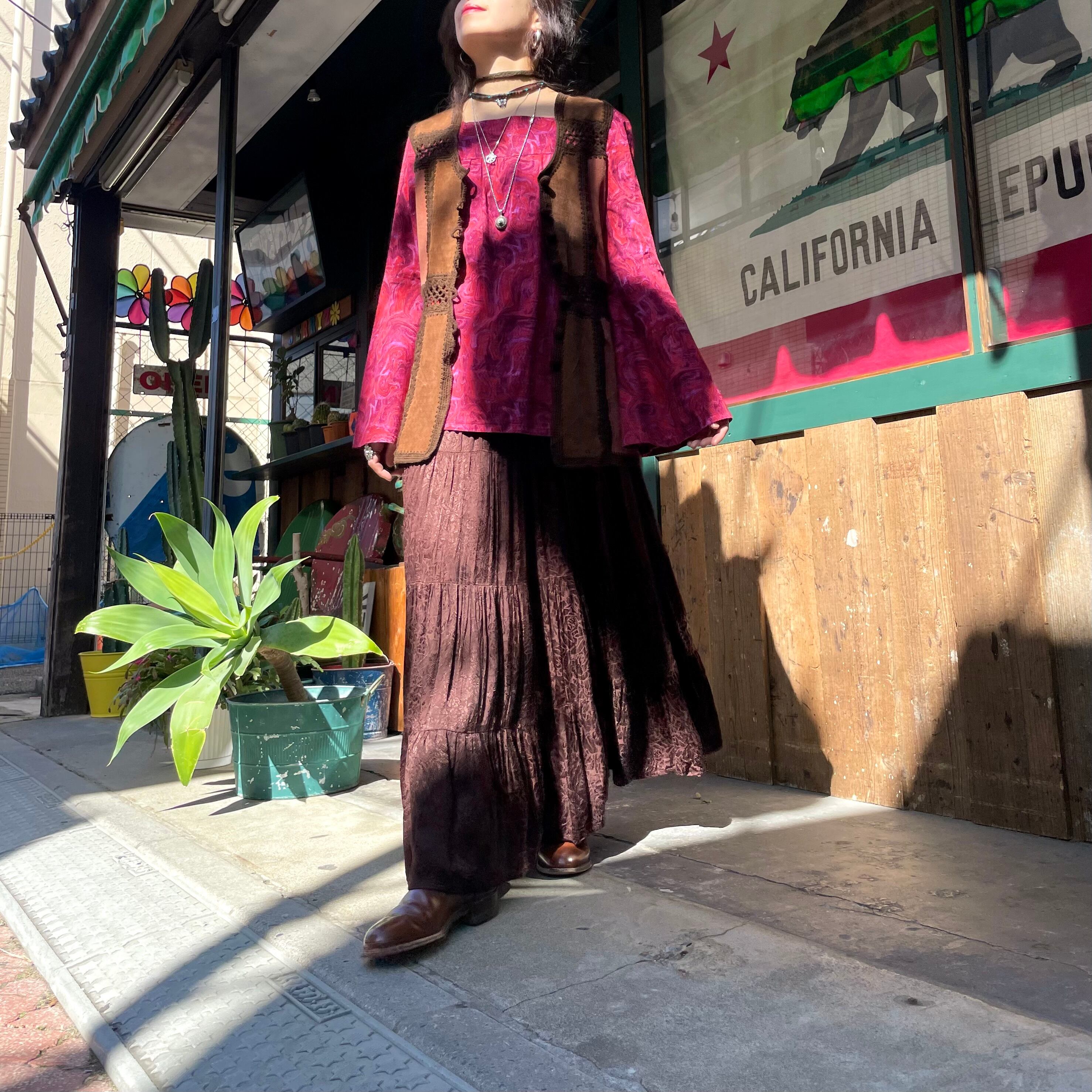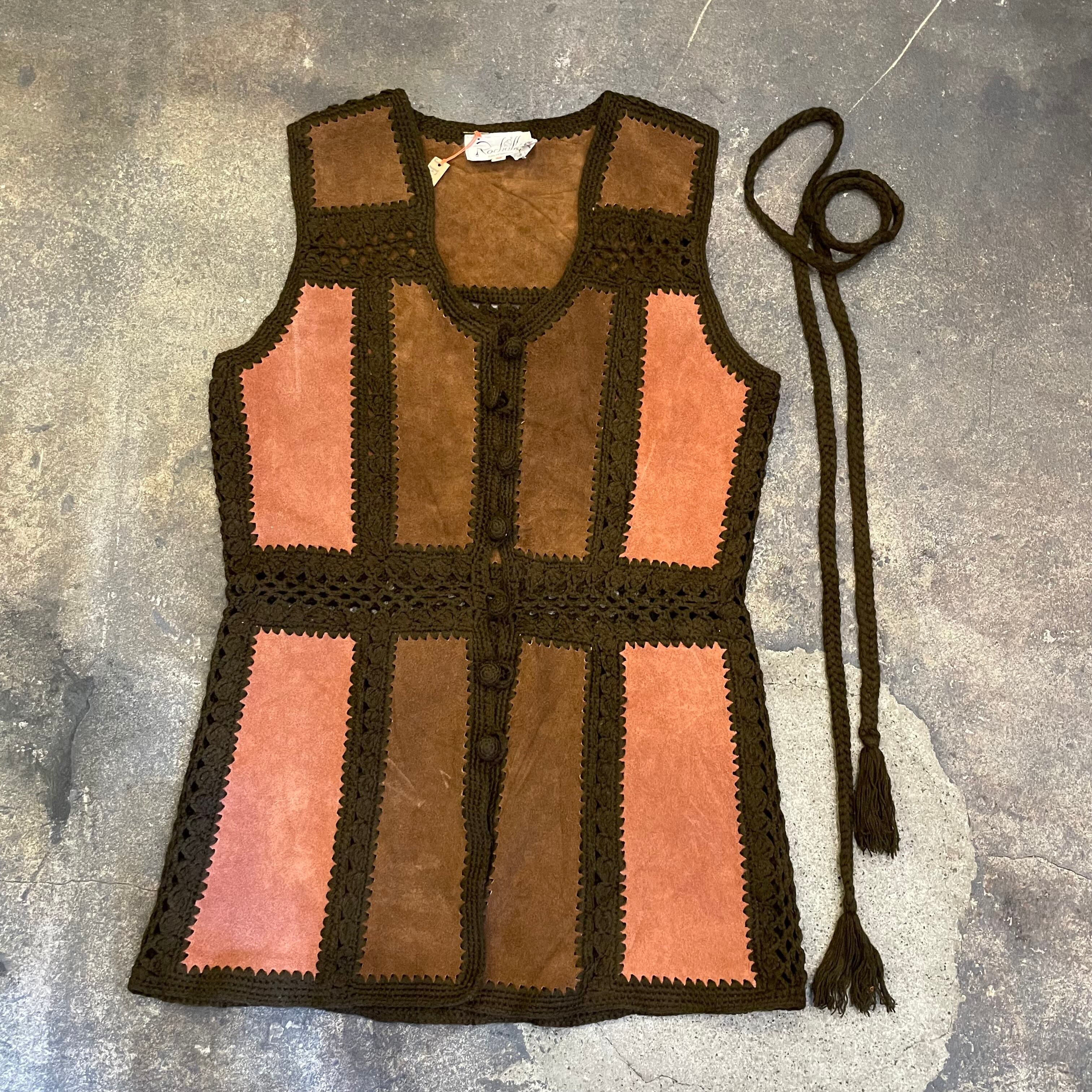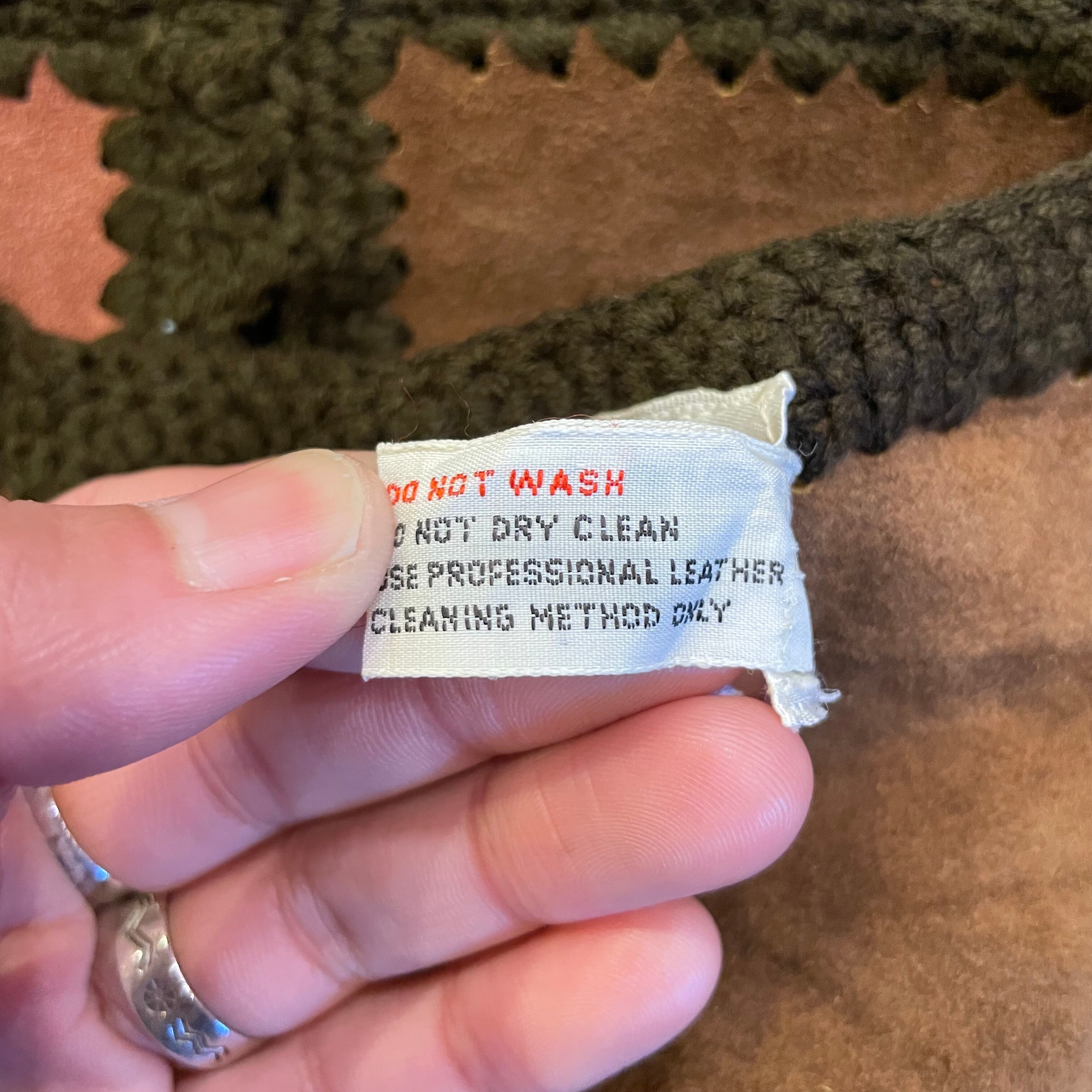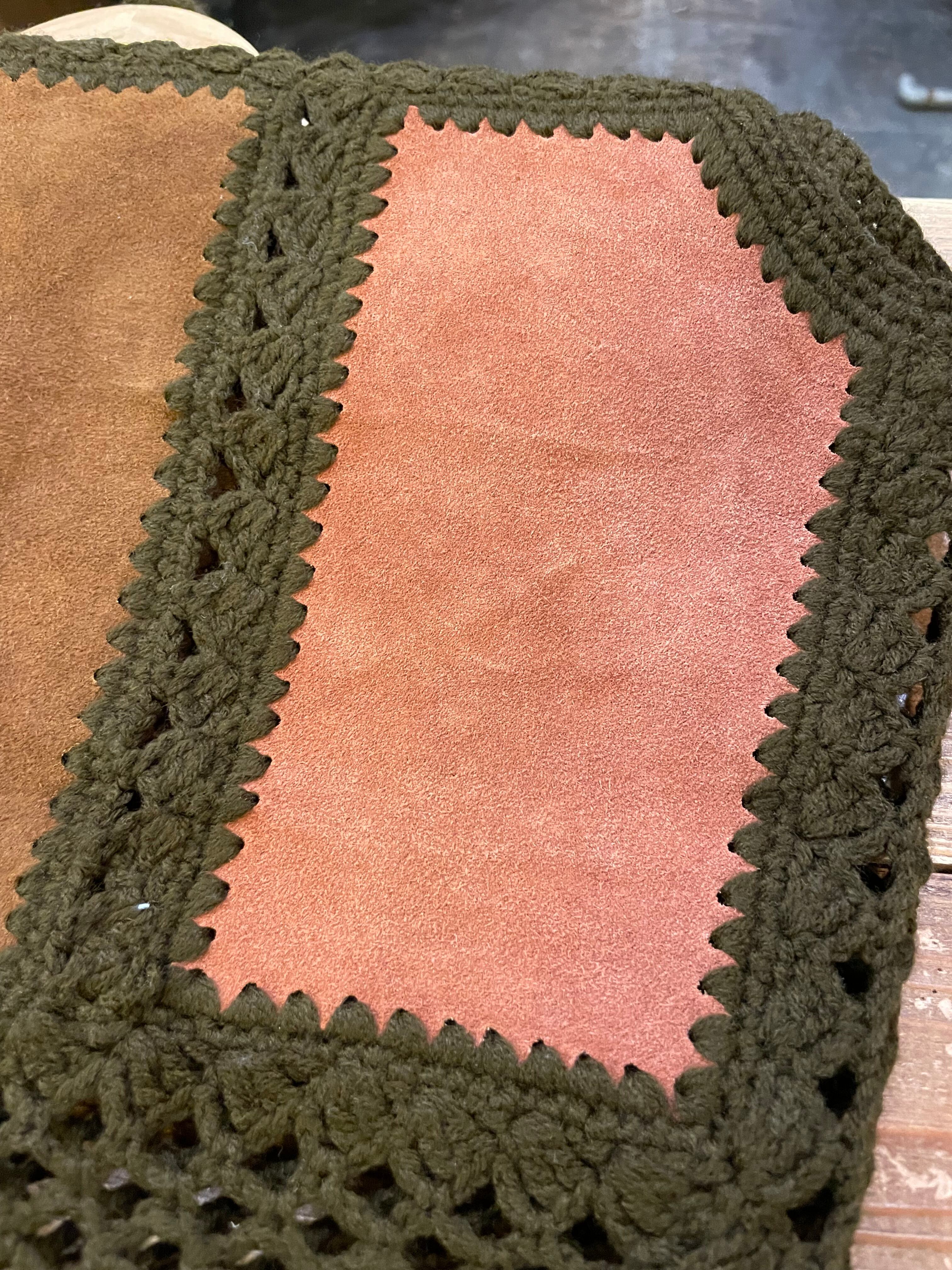 薄手のスエードのパーツをかぎ針編みで繋いでいて、柔らかく着心地もよいですしヒッピーな雰囲気がとてもかわいいですね。