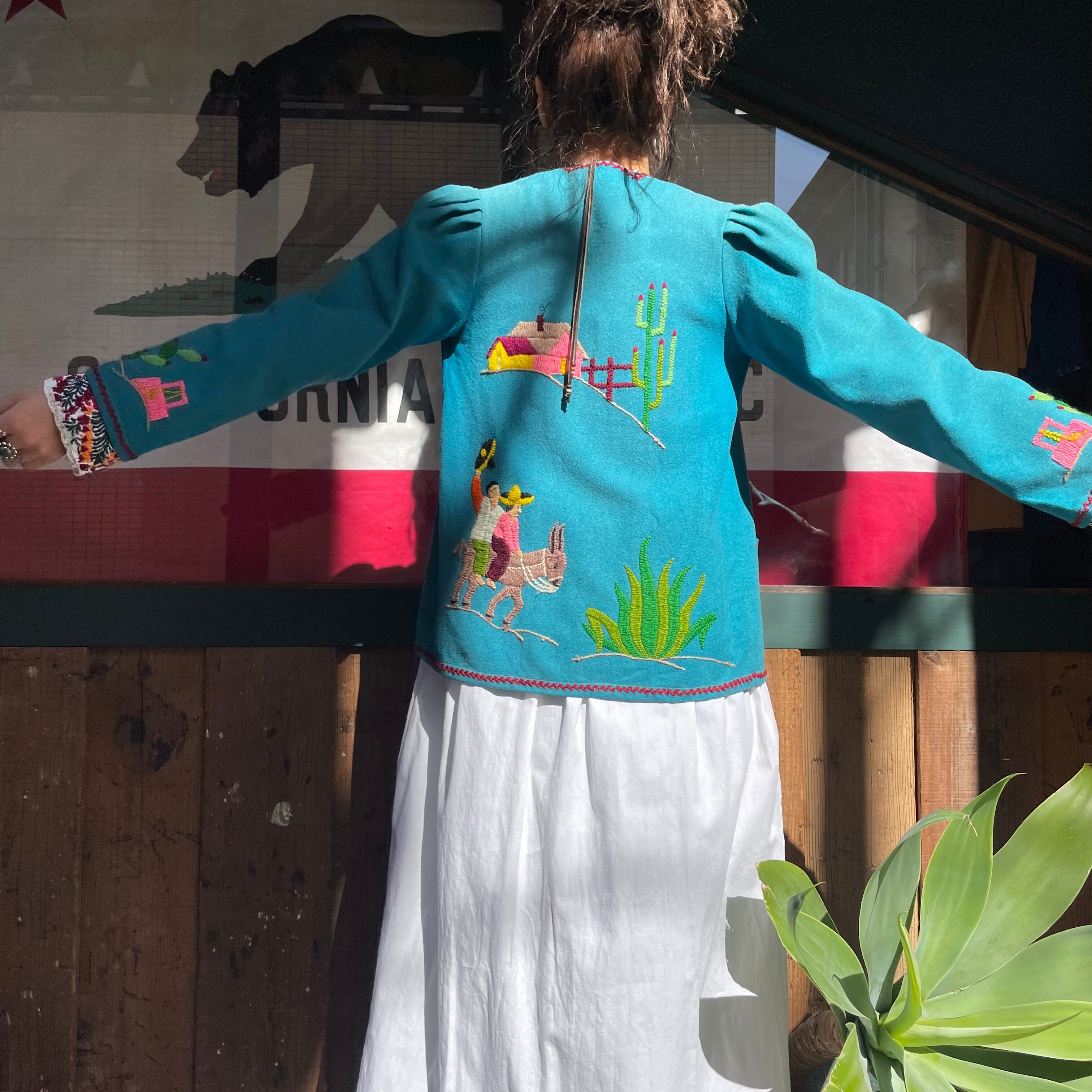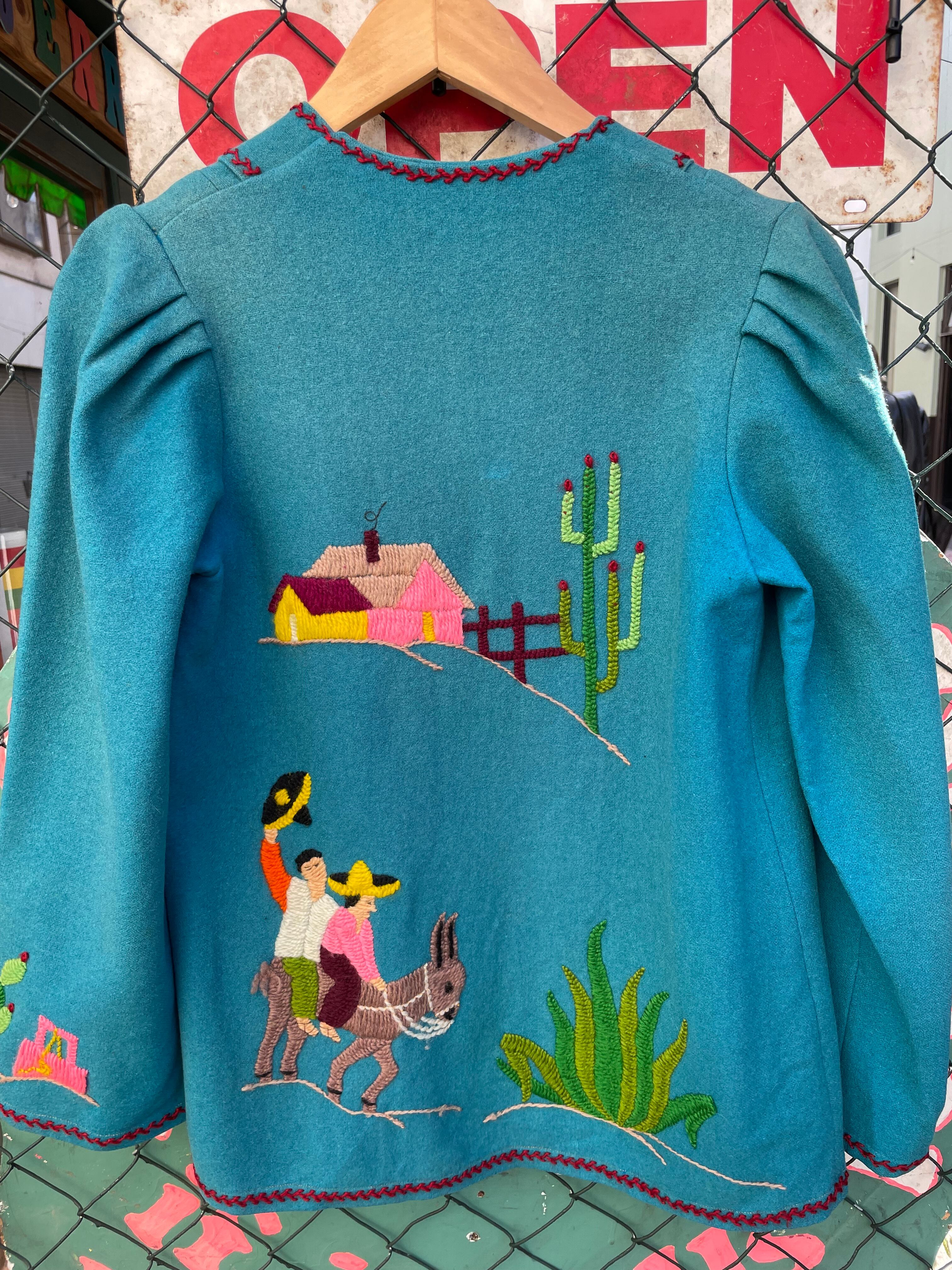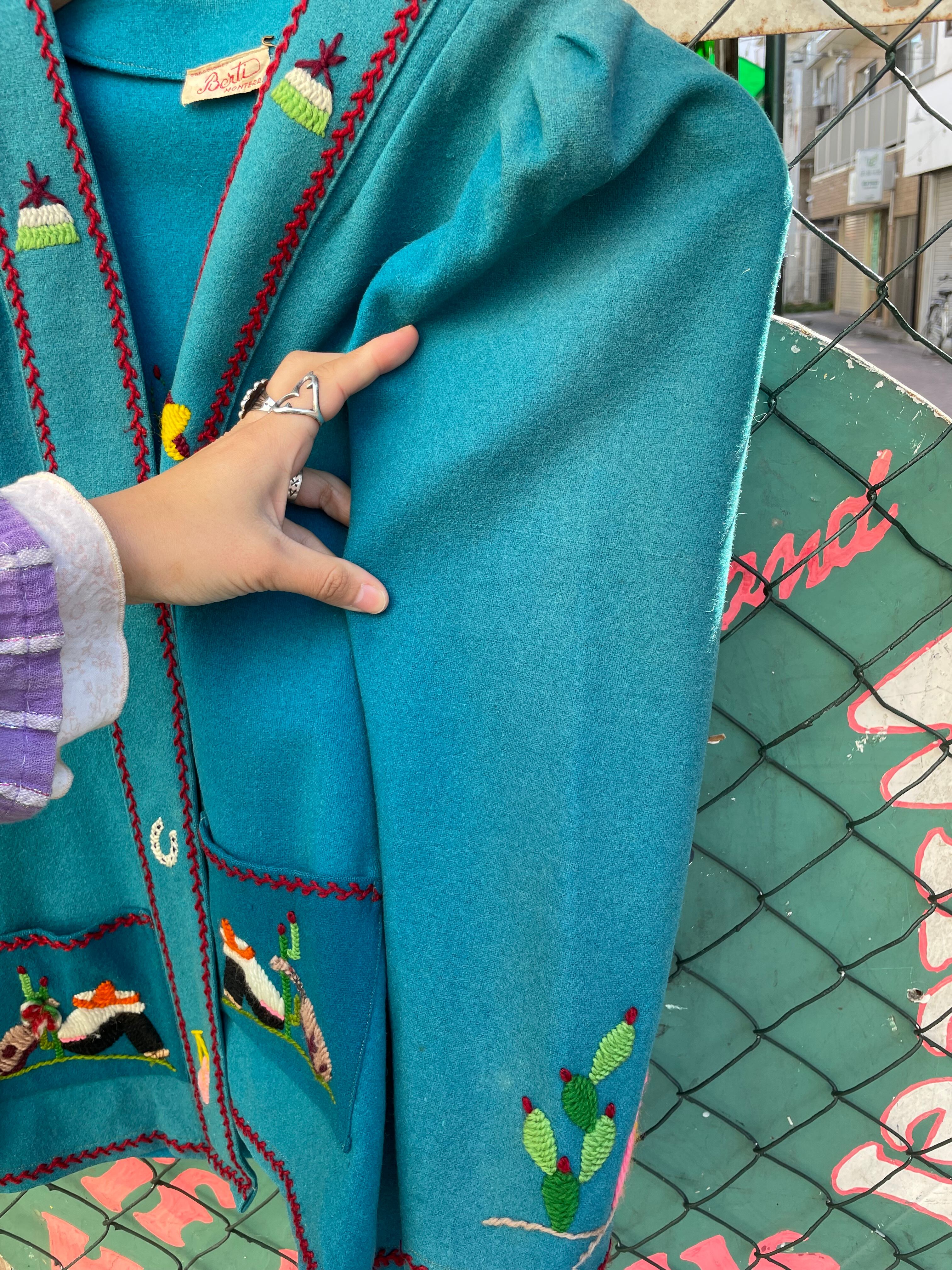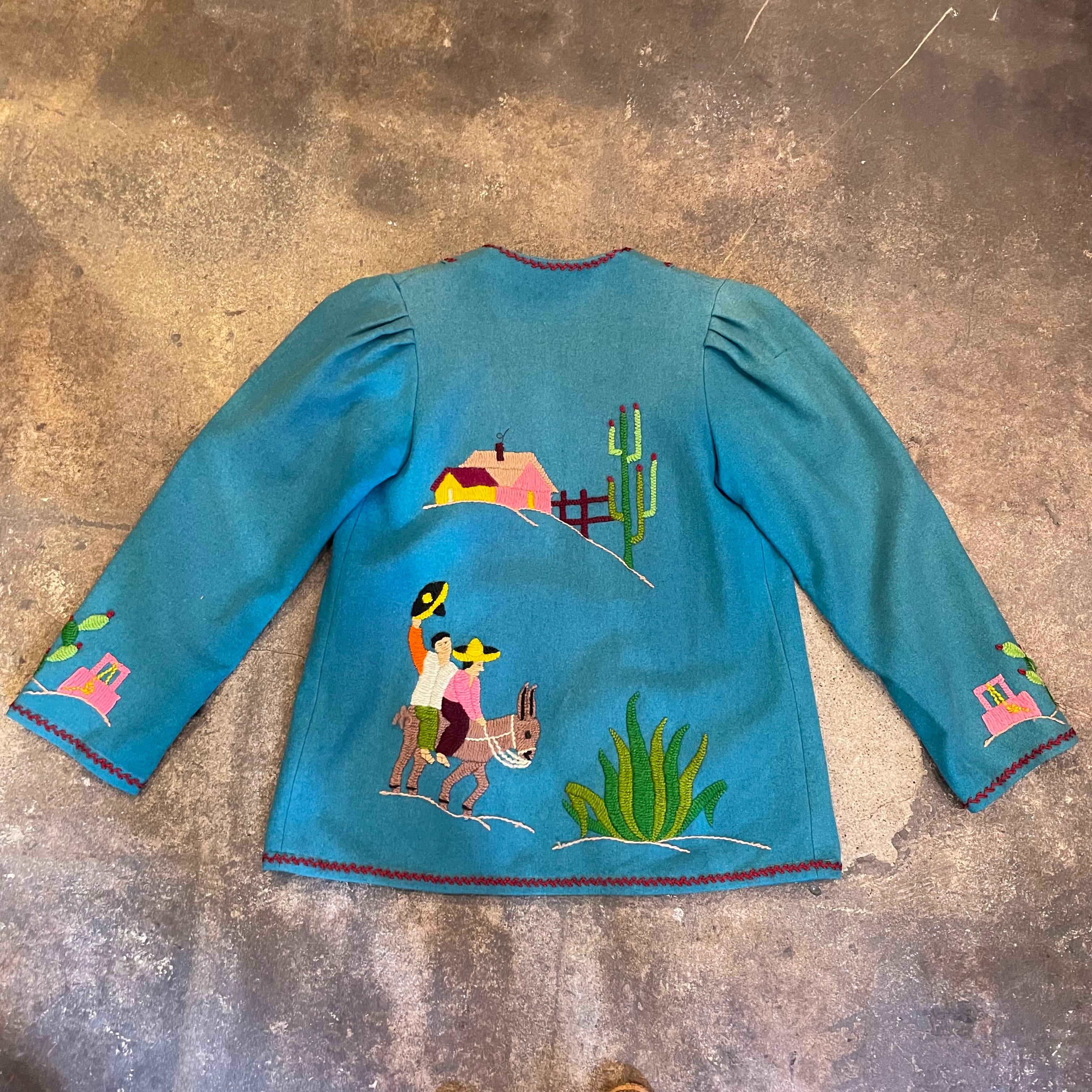 ターコイズブルーにサボテンや家、ロバや人間、アガベの手刺繍がかわいい50〜60年代頃のメキシカンジャケットです。
