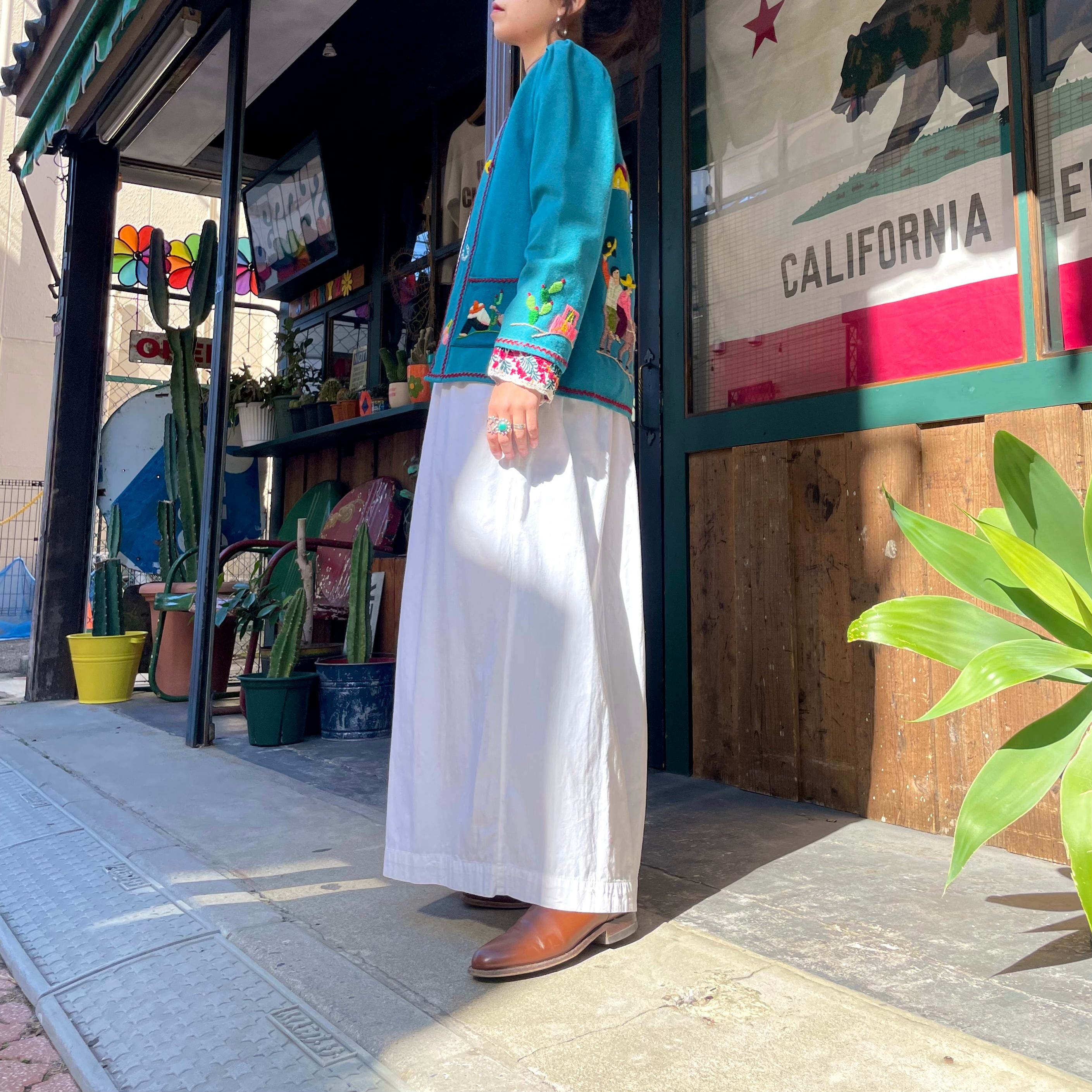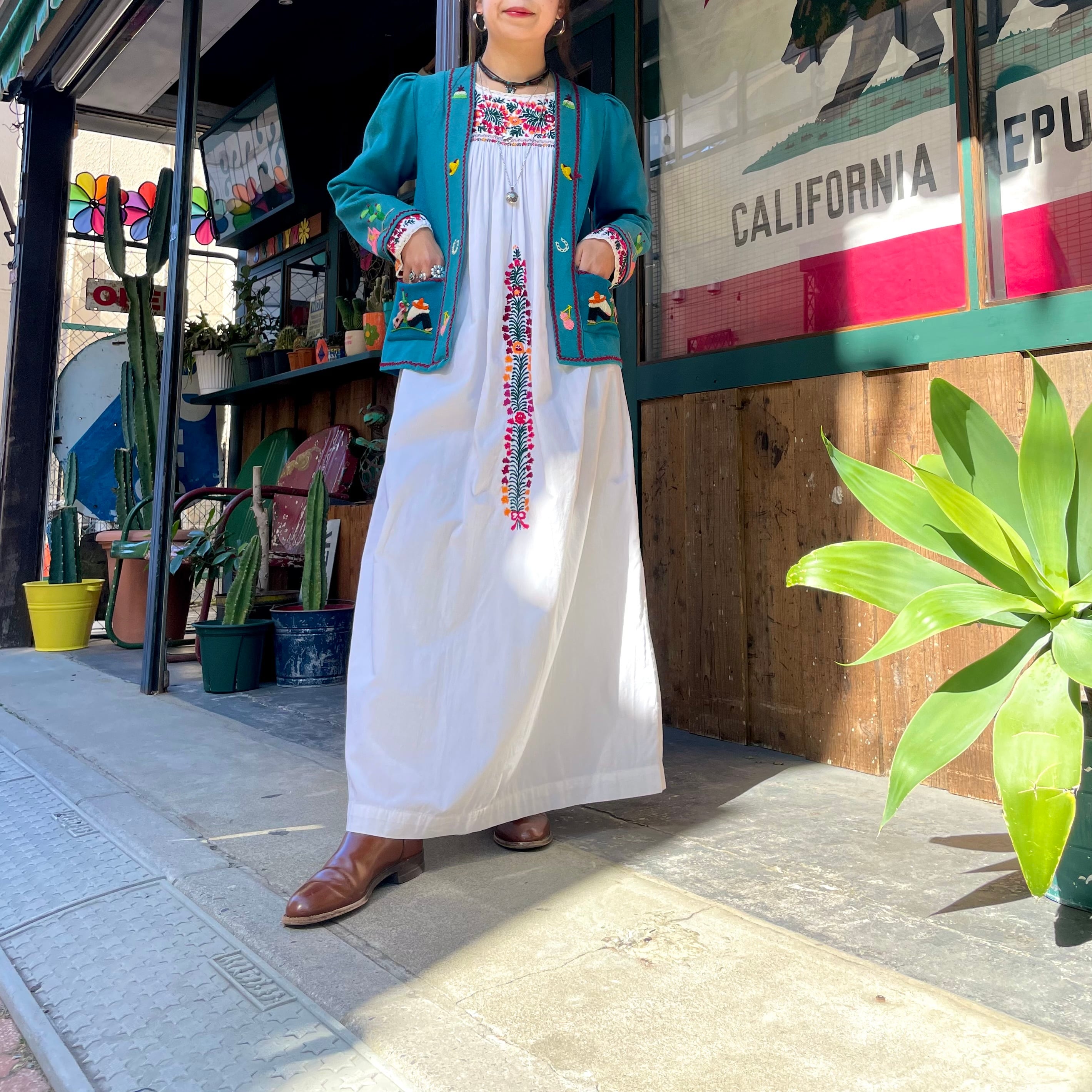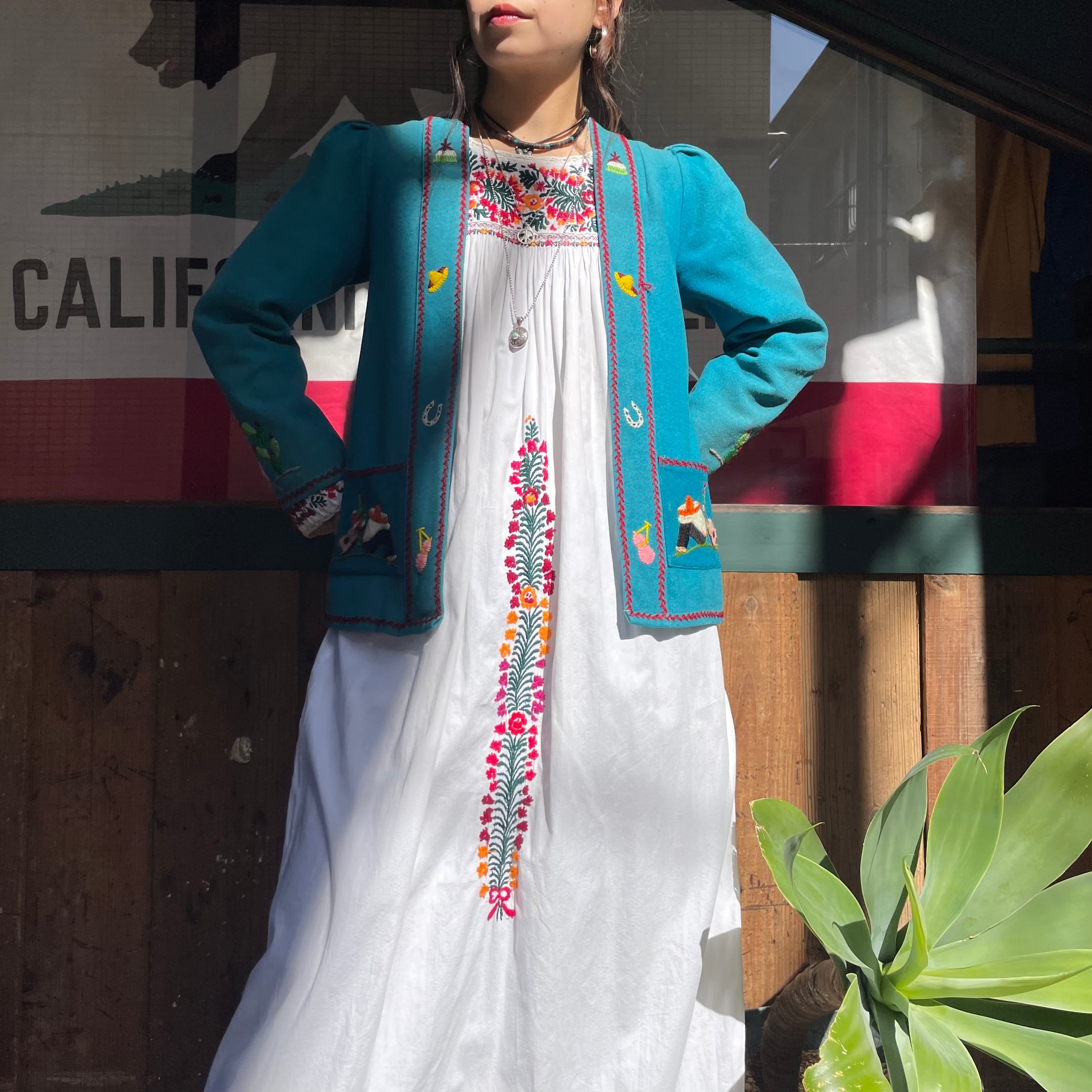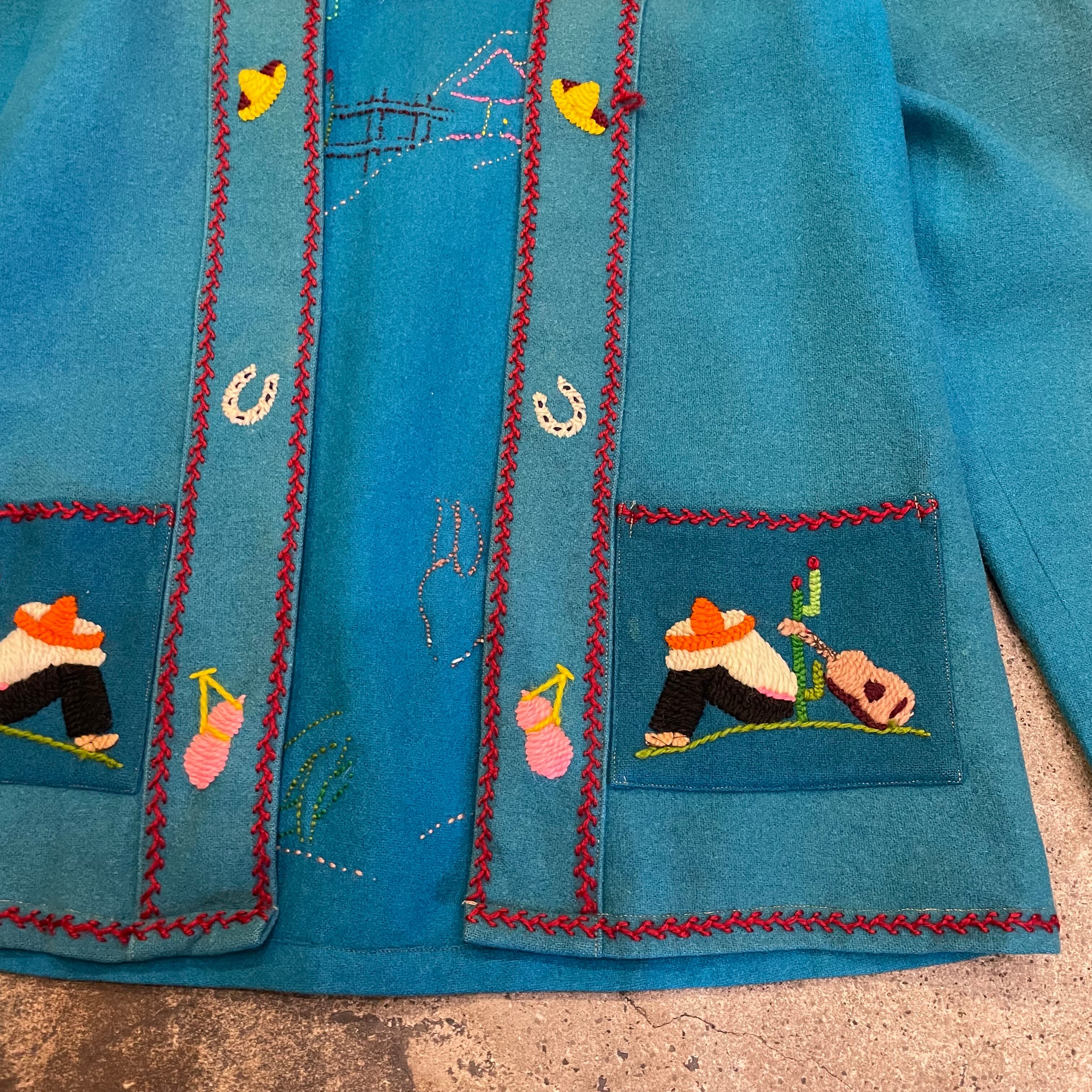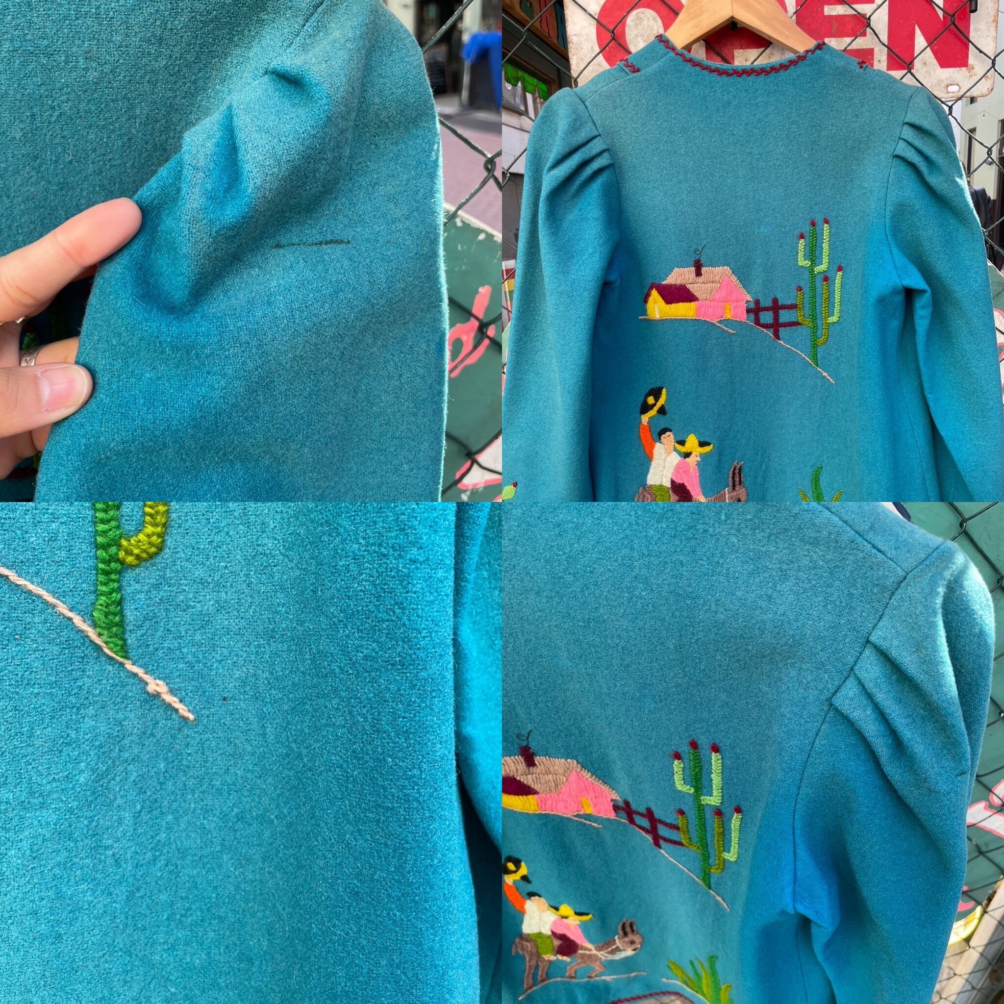 ターコイズブルーにサボテンや家、ロバや人間、アガベの手刺繍がかわいい50〜60年代頃のメキシカンジャケットです。