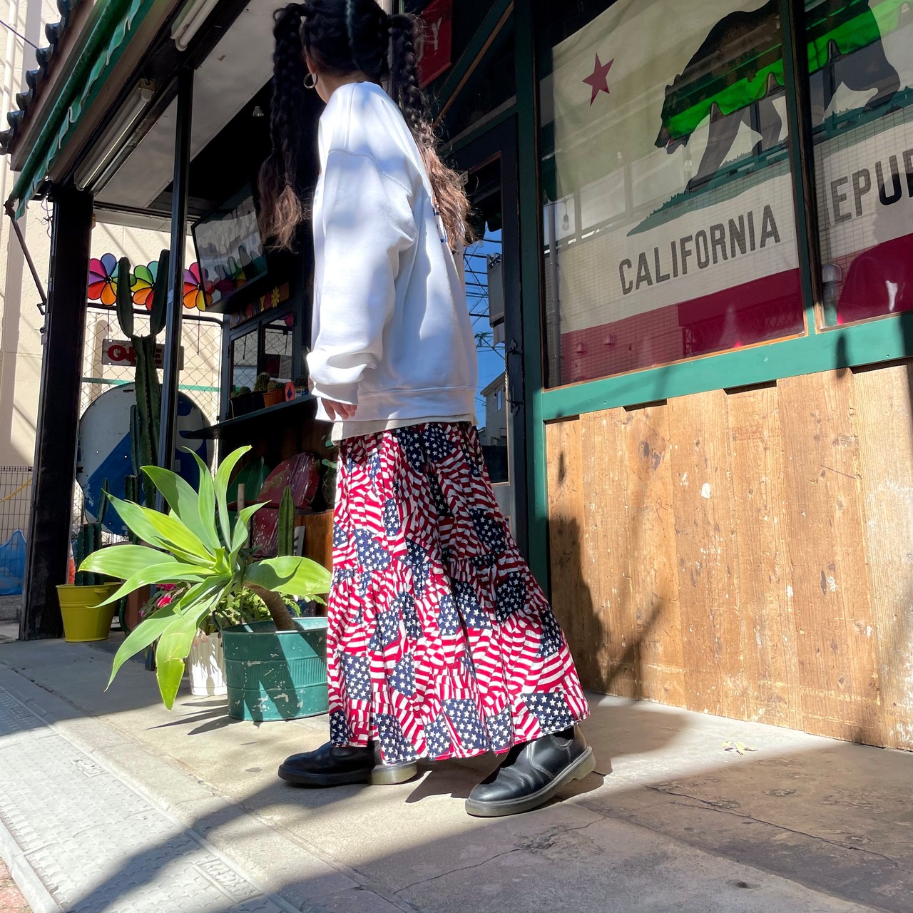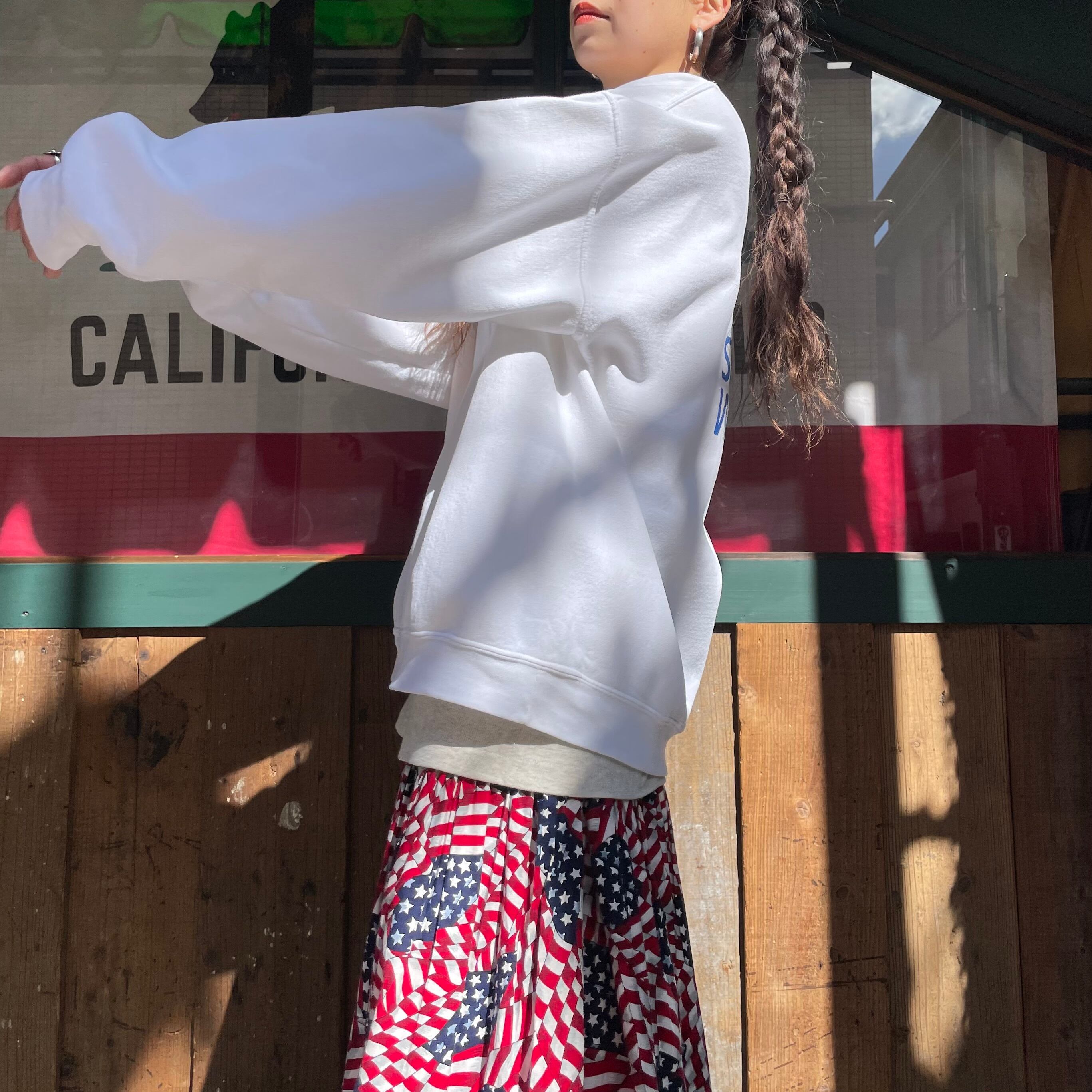 ゆったり大きめなサイズ感も楽ちんで良い感じです。このスウェットを着てペンキを塗ったりして汚していくのもかわいいと思いますし、ストライプのパンツや真っ赤なスカートと合わせたりしてポップに着たい一枚です。